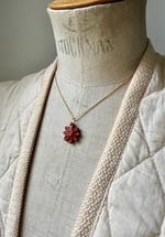 Elle est en jaspe rouge mat, sculptée à la main . Son anneau torsadé est en argent avec une dorure de 3 microns .