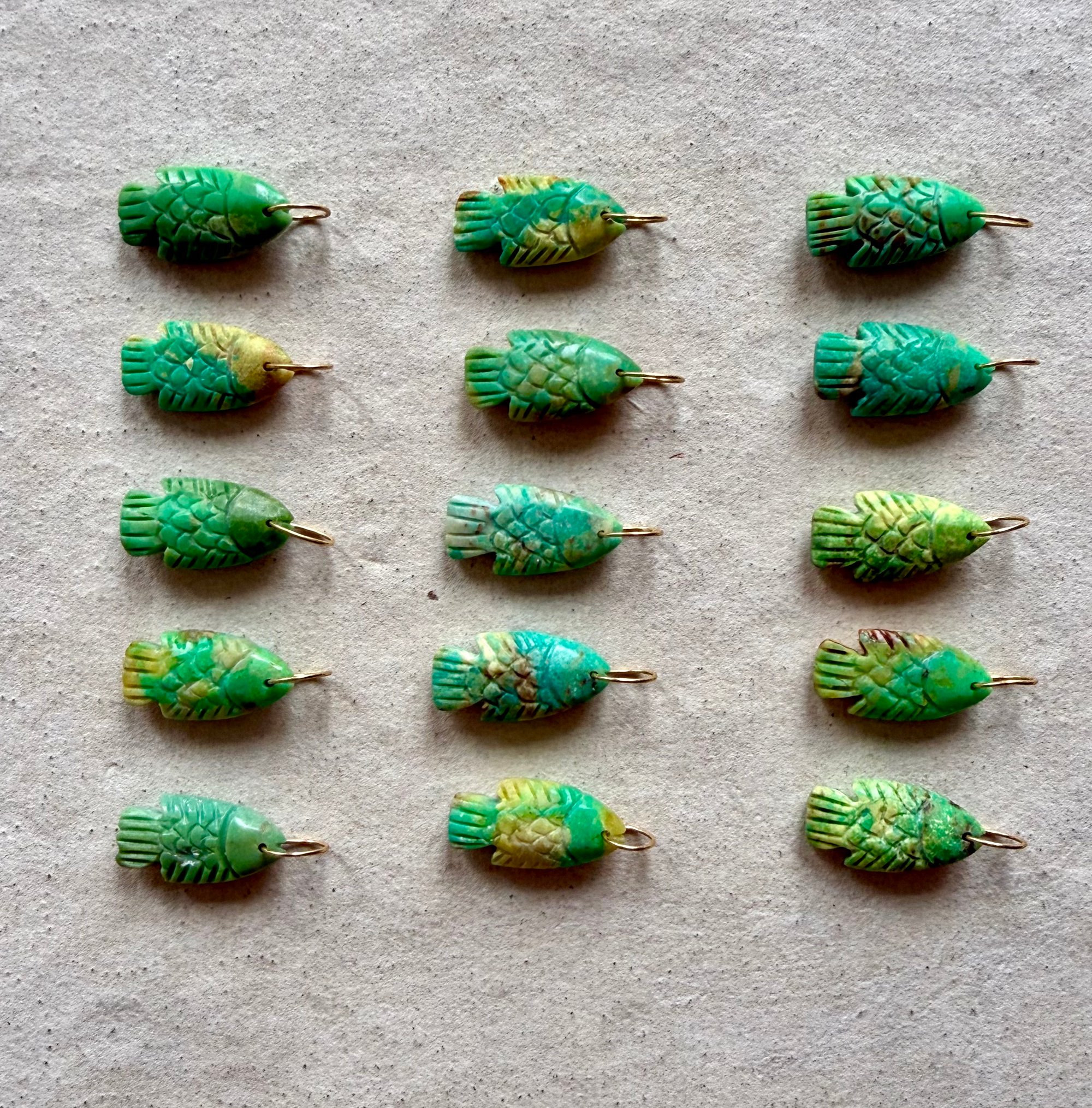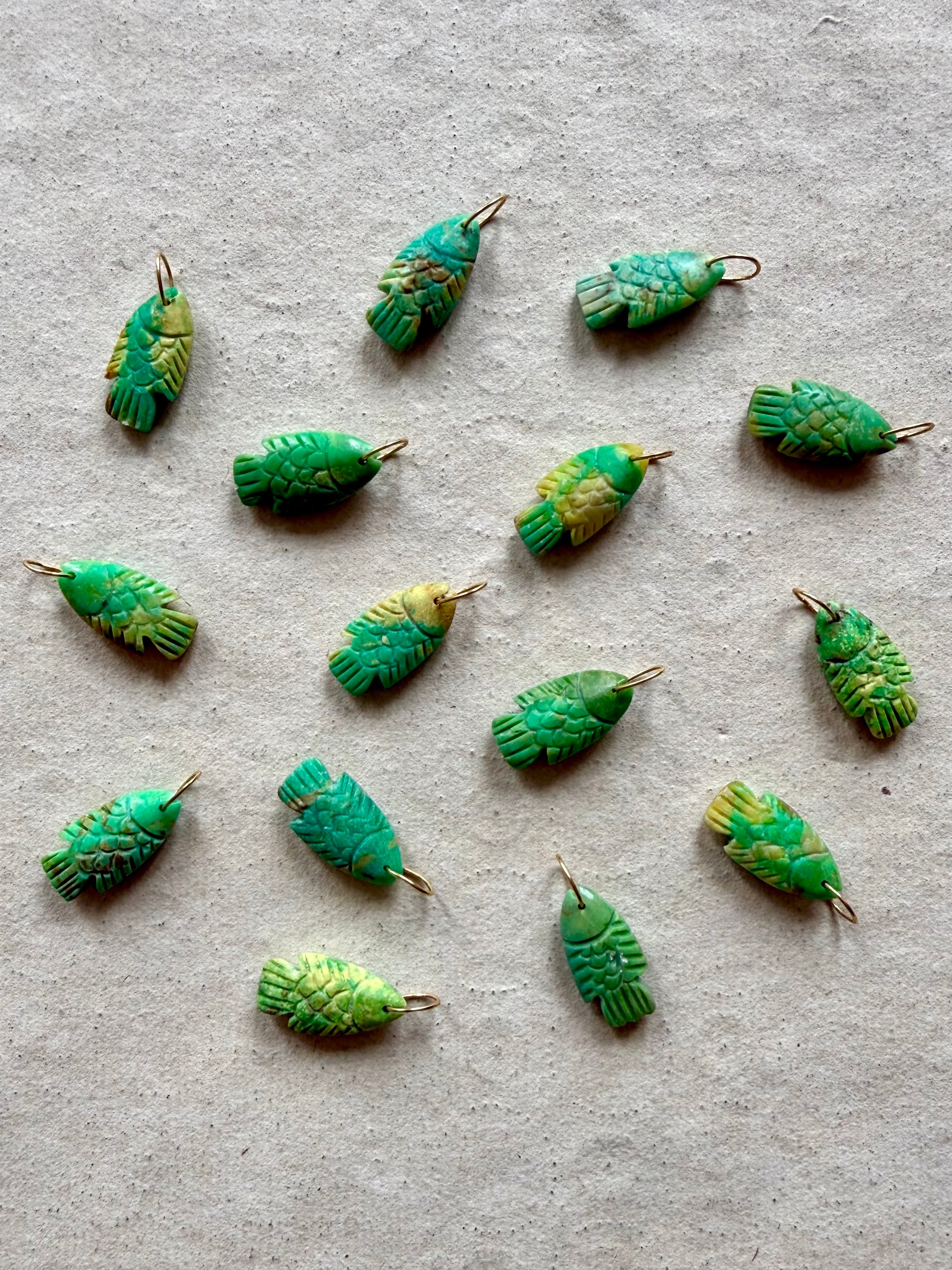 Magnifique et lumineux petit poisson en turquoise verte naturelle, avec ses nervures ocre jaune . Son anneau vous permet de le glisser avec vos autres charms. Chaque poisson est sculpté à la main a l’atelier et est unique , il en existe 15 exemplaires.