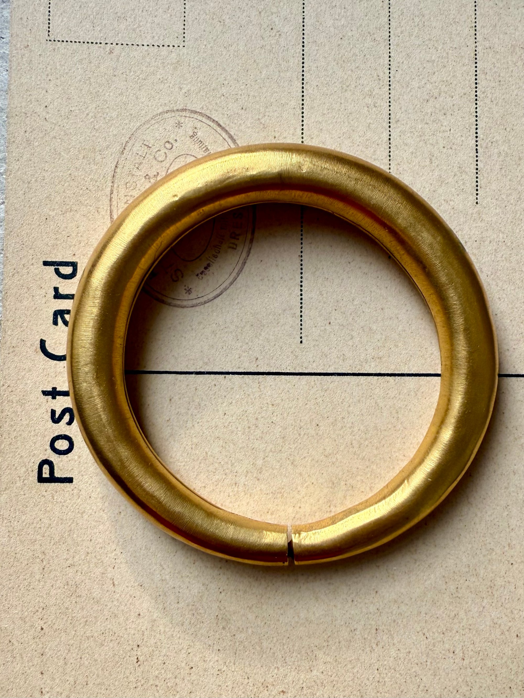 ce jonc est traditionnellement porté au Rajasthan et au Gujarat. Il est plus fin au niveau de l’attache . Il est travallé en creux et très léger à porter . Pour le porter , il suffit d’écarter la partie fine et de le tordre légèrement pour y glisser votre poignet . Faire la même manipulation en sens inverse afin de réemboiter l’attache à l’intérêt du jonc . Il est en laiton ( pour sa flexibilité) plaque or mat brossé 3 microns 24 carats pour lui apporter toute son intensité . ⚡️⚡️⚡️seulement pour petits poignets fins !