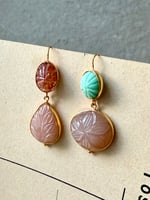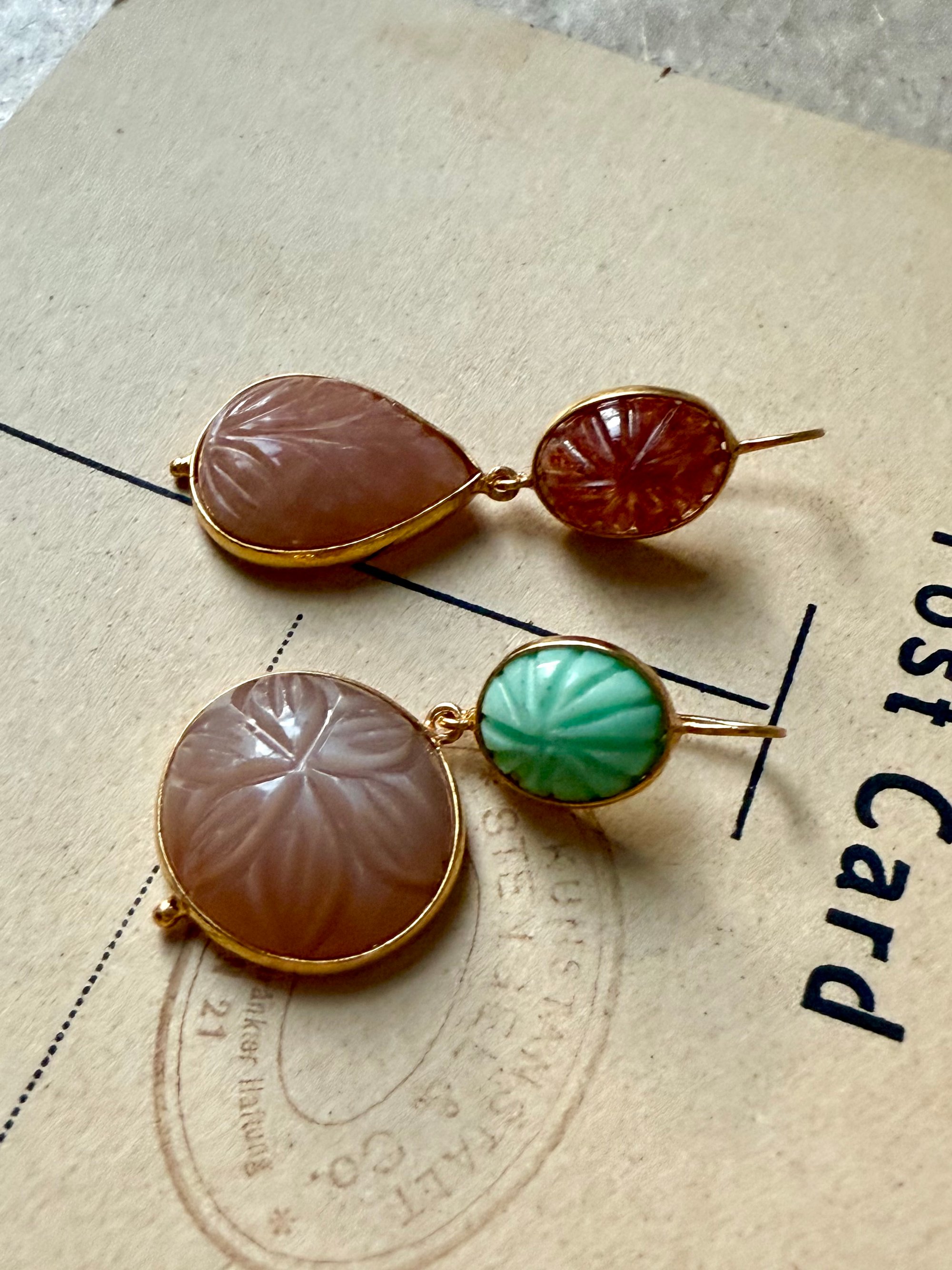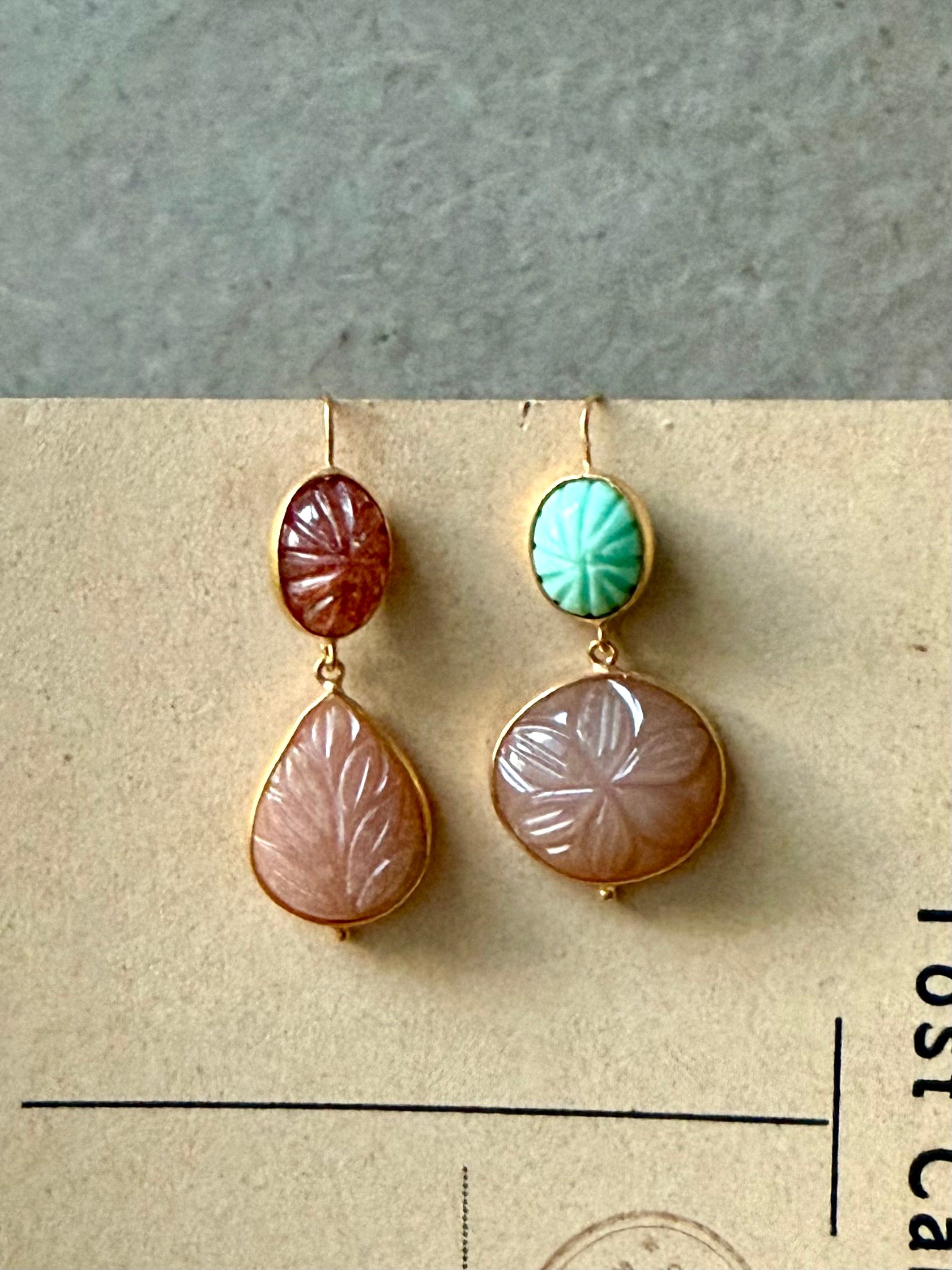 Boucle unique vendue à l’unité, composée de belles pierres fines taillées à l’atelier et assemblées. Les contrastes de couleurs révèlent l’intensité des pierres et les gravures. À vous de composer votre paire ou bien à porter seule .