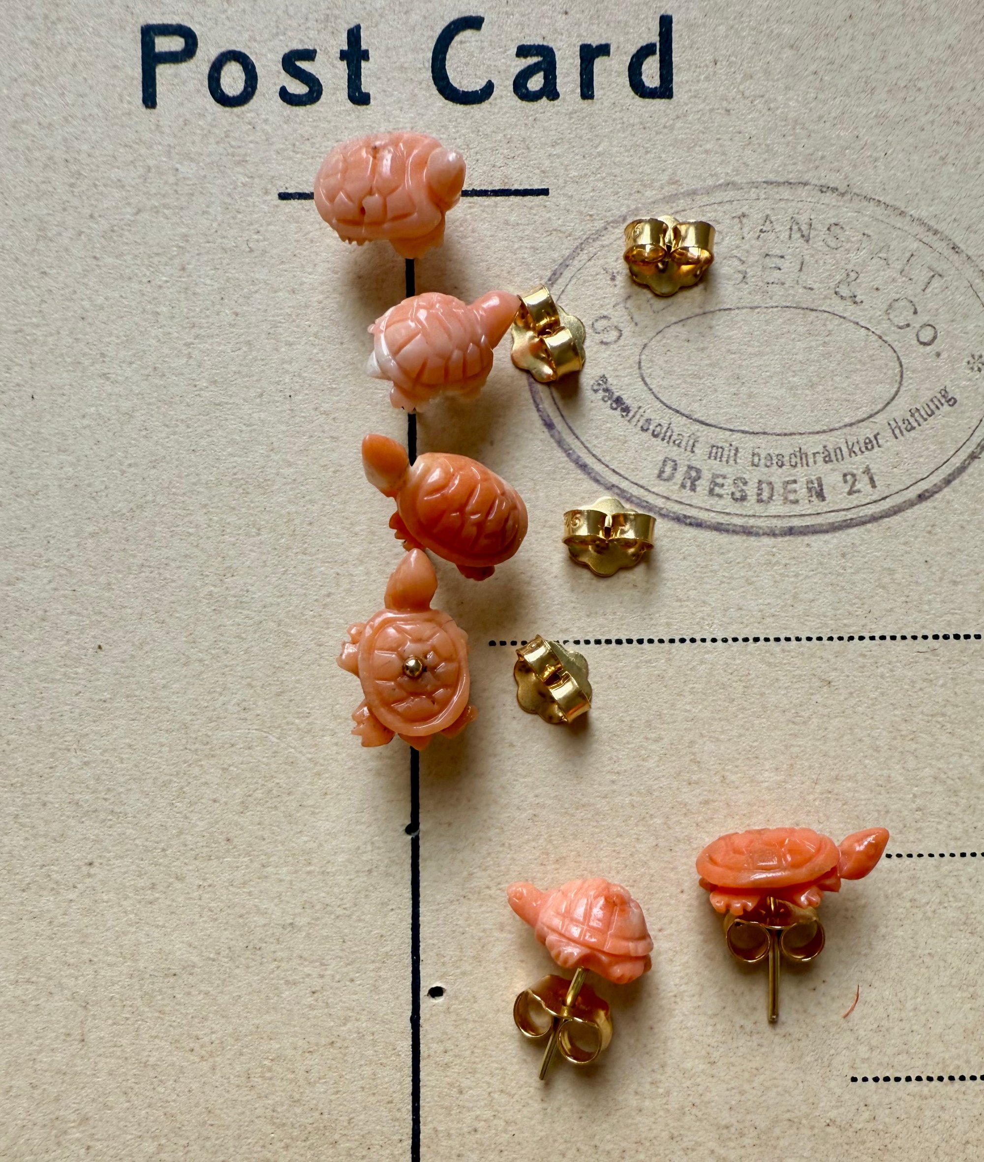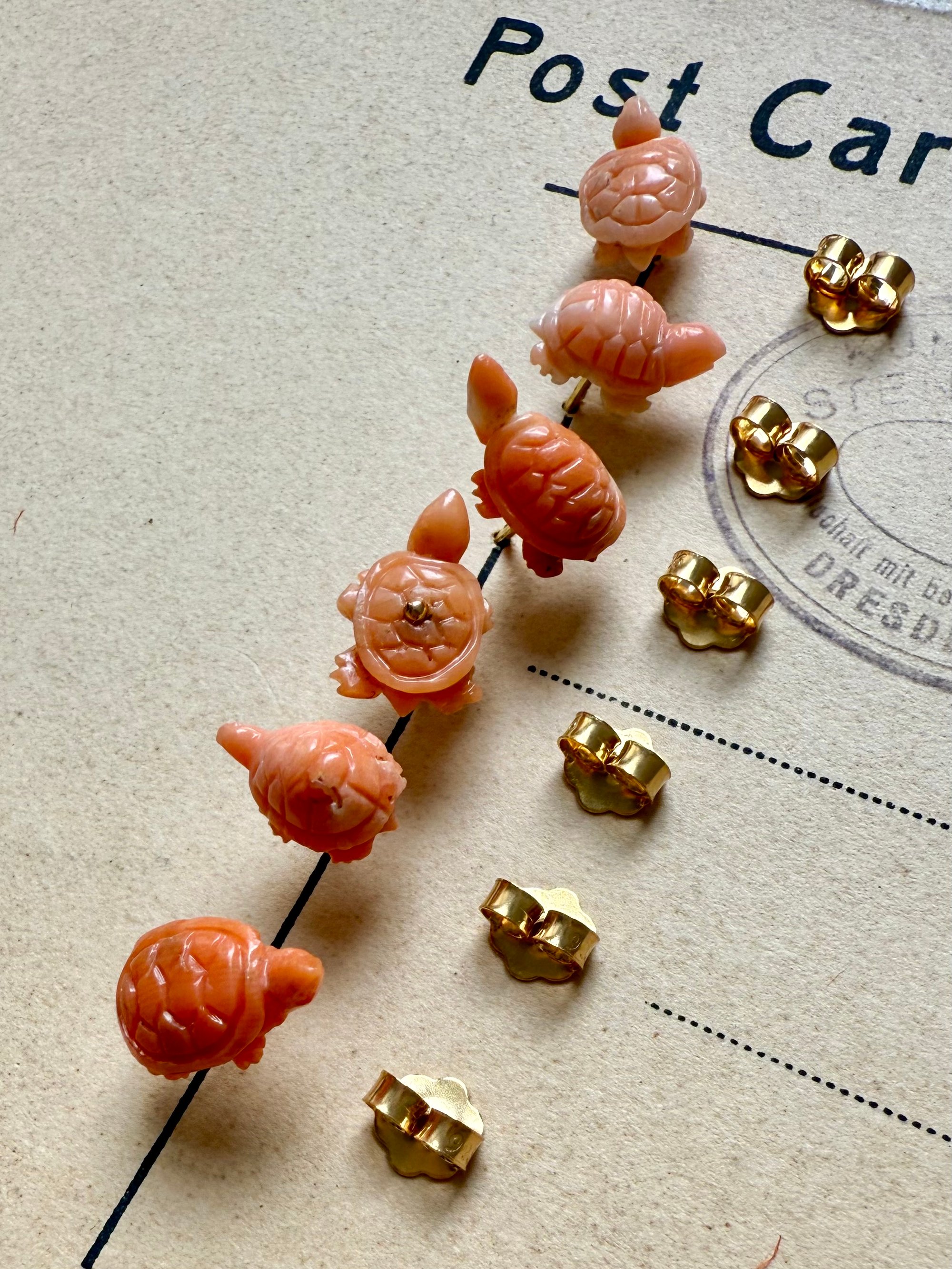 Mono boucle d’oreille composée de minuscule tortue en corail ancien et d’une tige en or 14