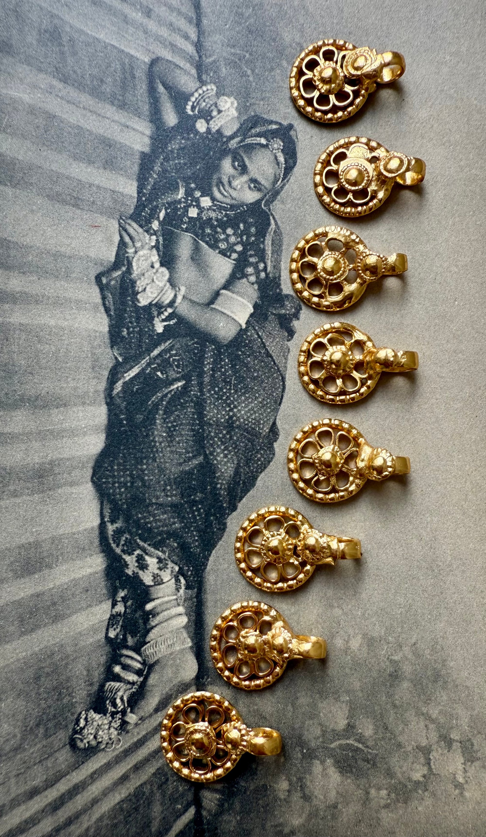 Amulettes anciennes indiennes en forme de fleurs, en argent bain d’or 24 carats 3 microns.