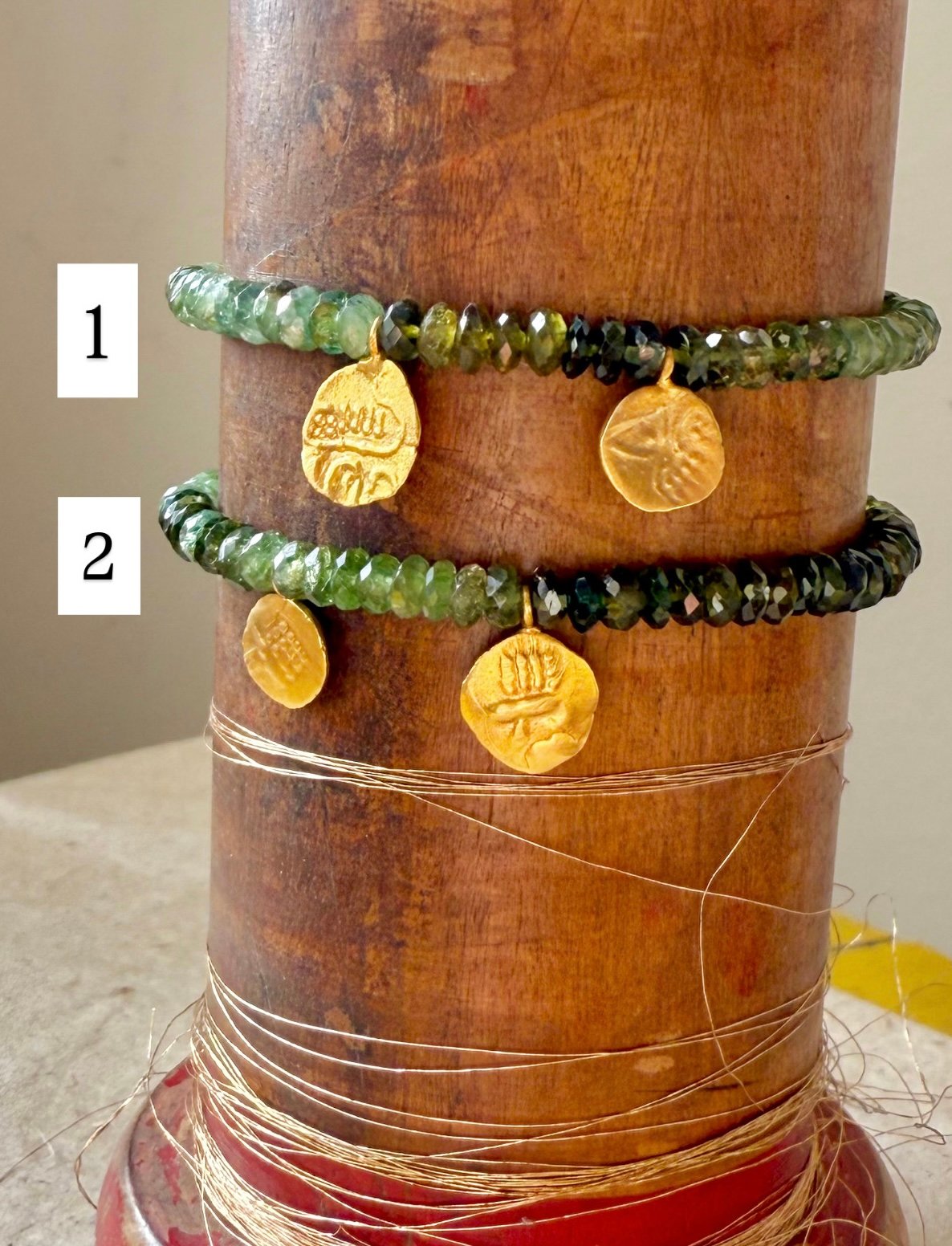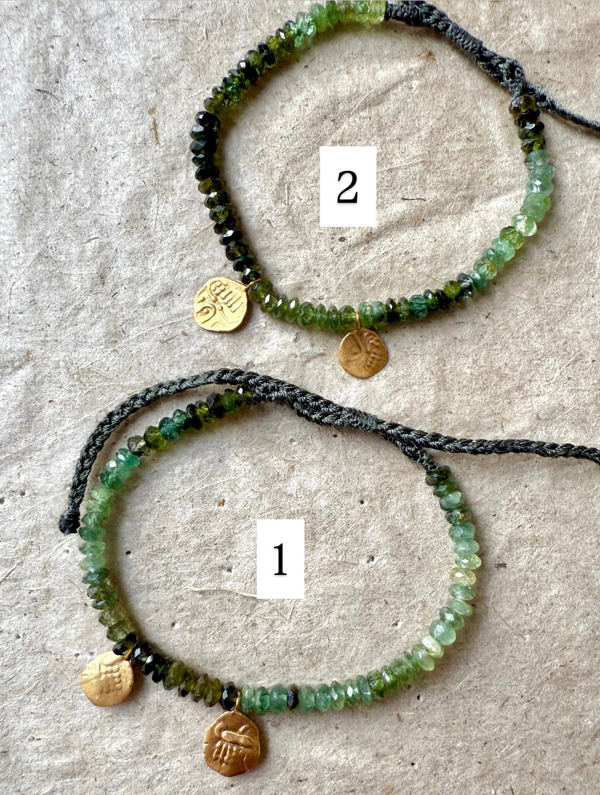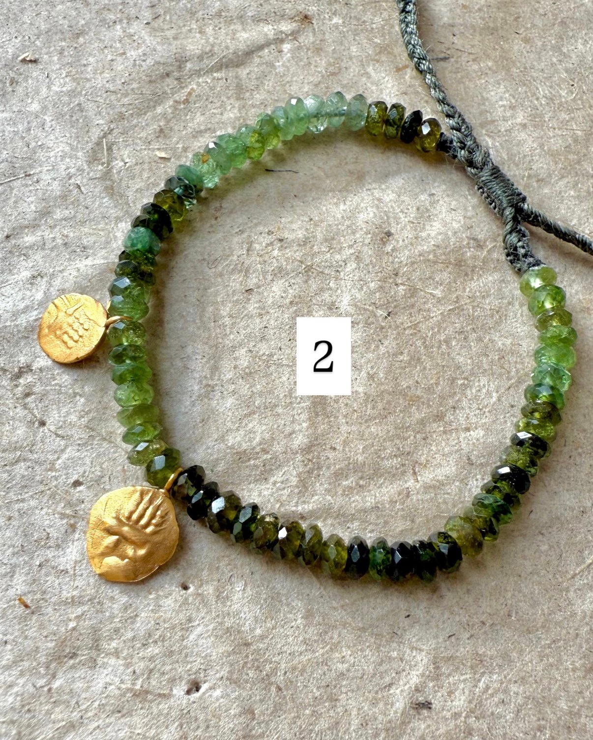 Bracelet réglable composé d’un brin de kyanites vertes aux nuances bleutées par endroits et de deux mini pièces réversibles . Finition soignées en tresses fines coulissantes Convient à tout les poignets .