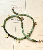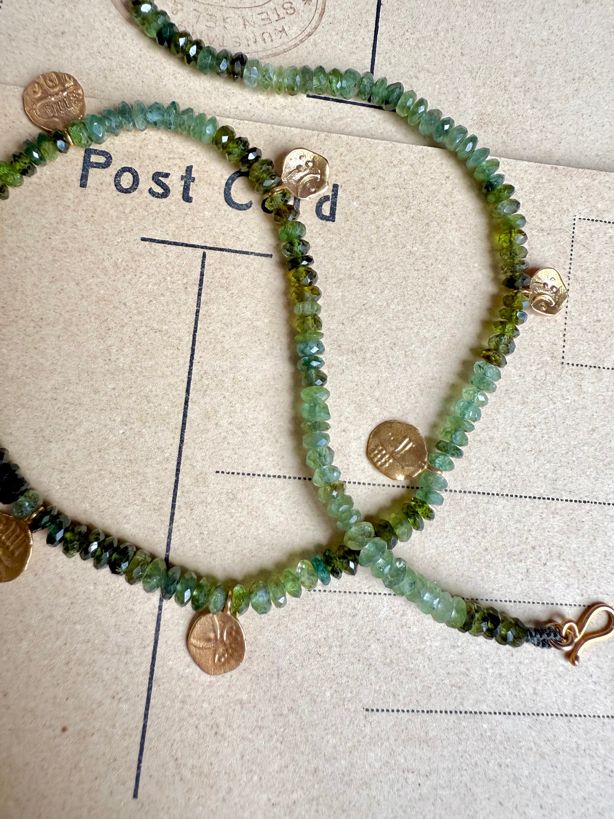 Collier 1 rang de tourmalines facettées, dans des dégradés de verts et bronze , parsemé d’amulettes , répliques de monnaies anciennes du sud de l’Inde , gravures double face , porter seul ou en accumulation .