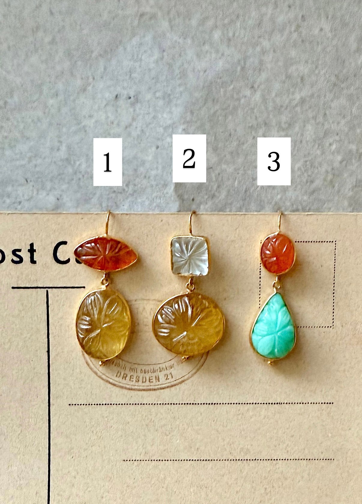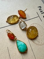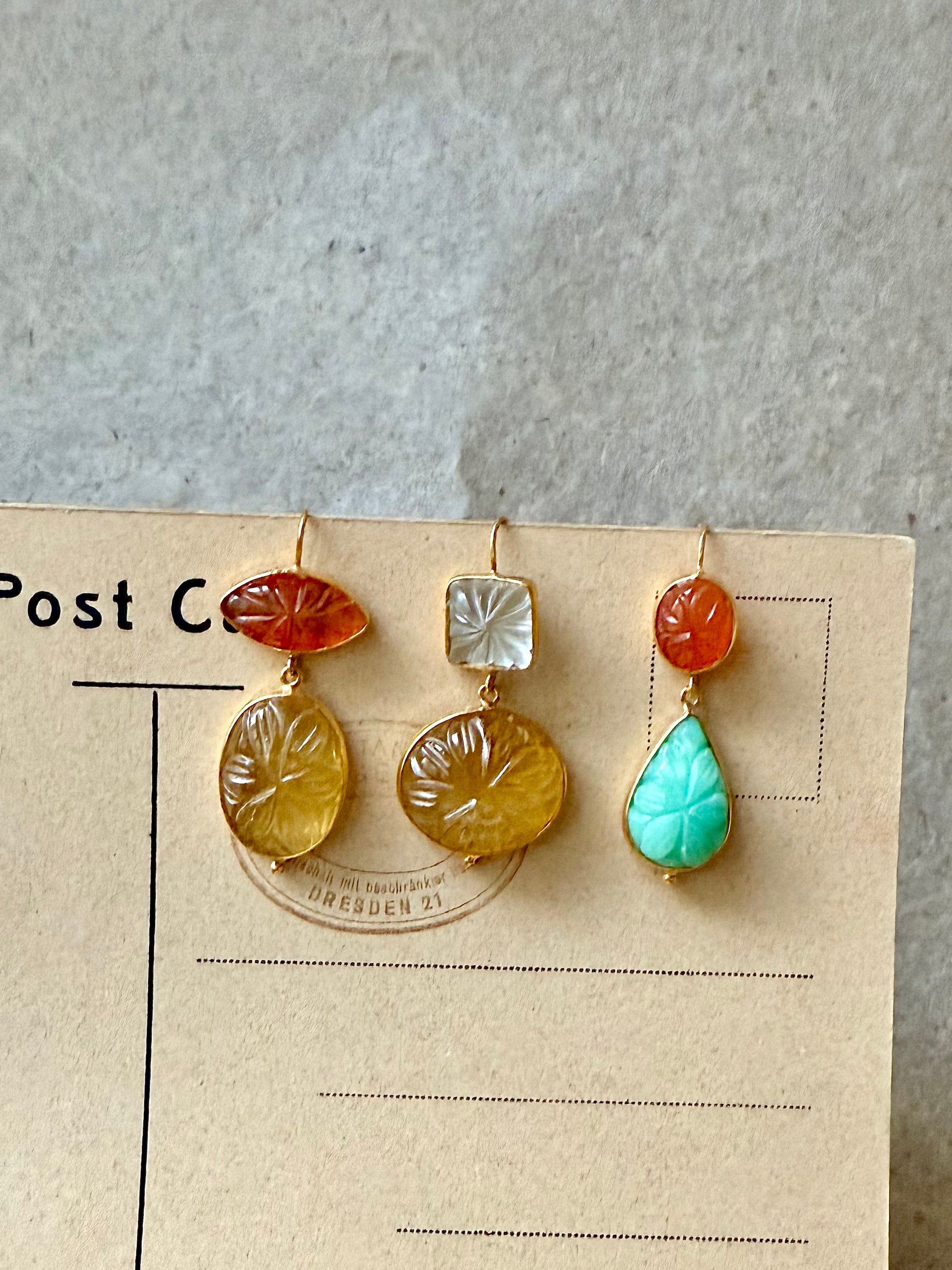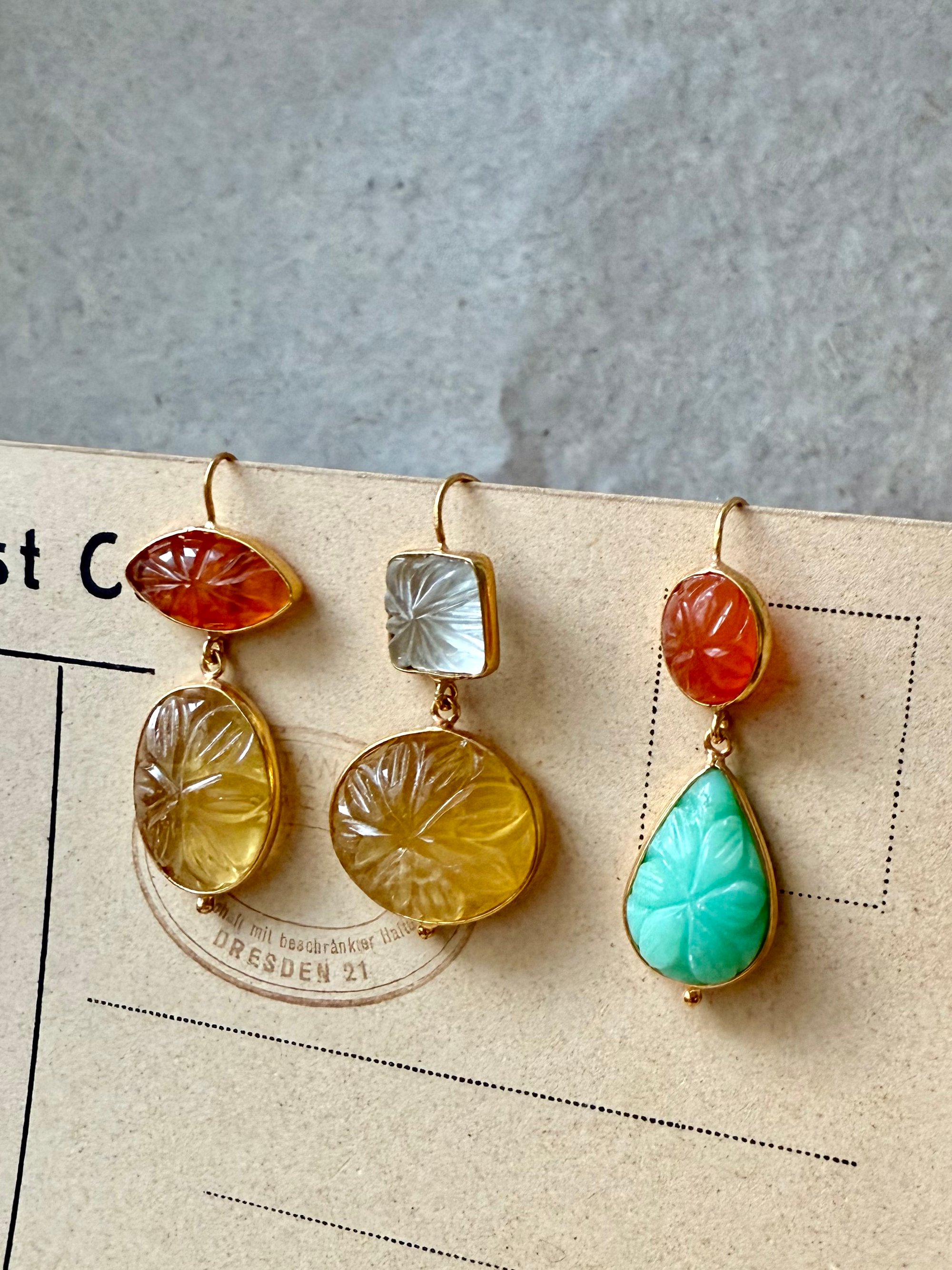 Boucle unique vendue à l’unité, composée de belles pierres fines taillées à l’atelier et assemblées. Les contrastes de couleurs révèlent l’intensité des pierres et les gravures. À vous de composer votre paire ou bien à porter seule .