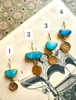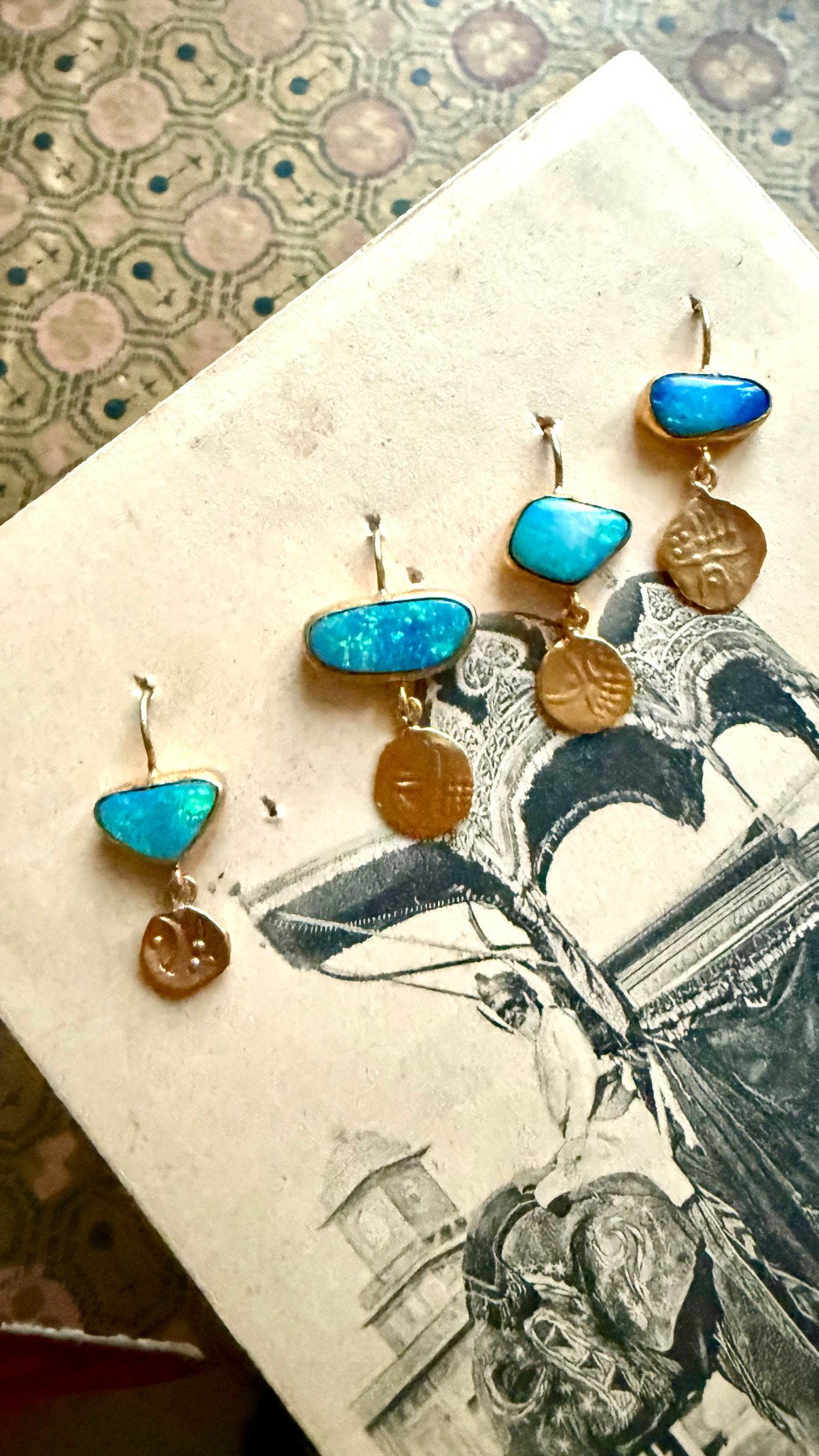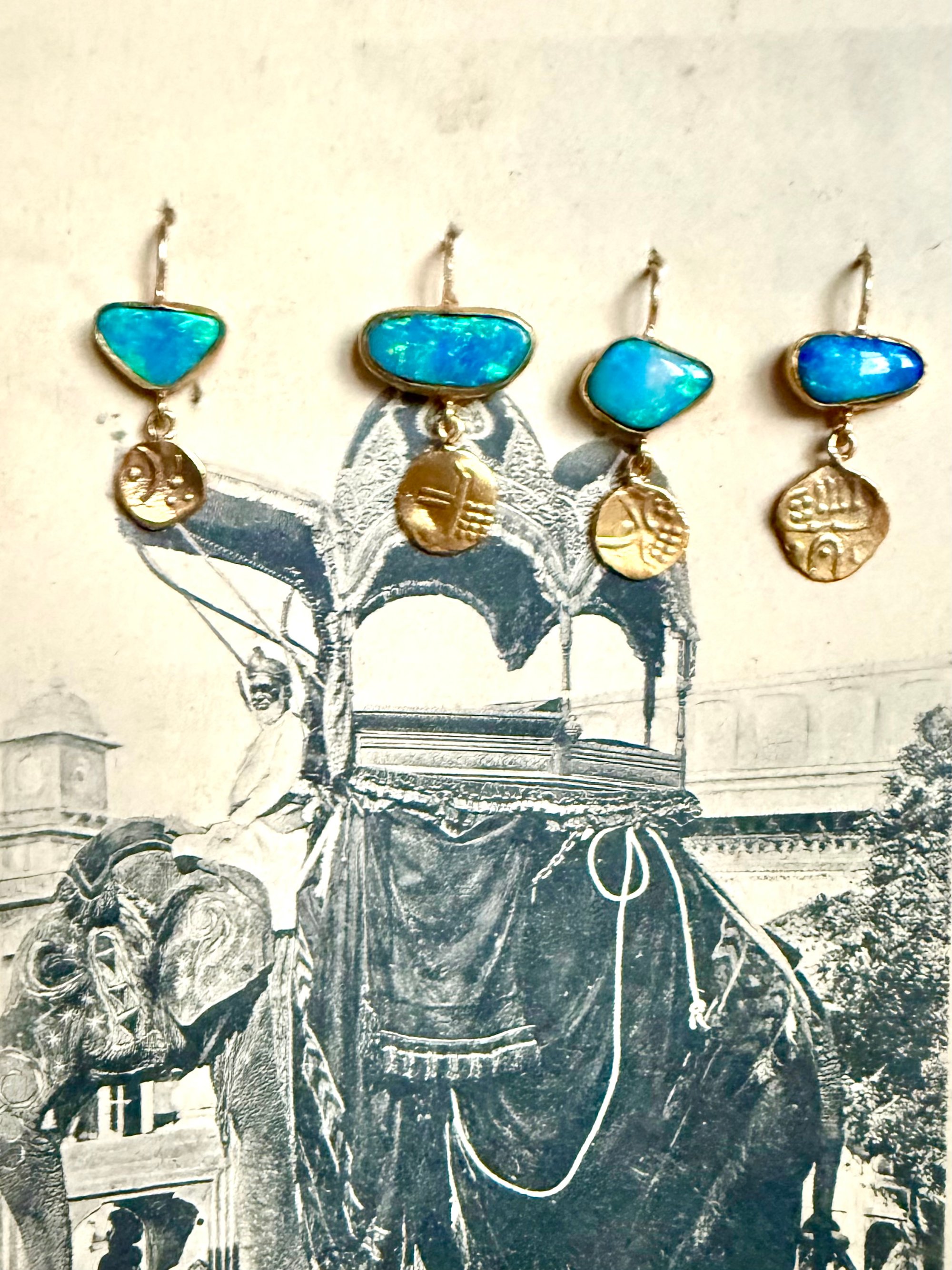 Boucles vendues à l’unité , composées de belles opales bleues aux multiples reflets iridescents , taillées et assemblées à l’atelier. Elles sont ornées de pampilles, répliques exactes d’anciennes minuscules pièces de monnaies antiques du sud de l’Inde .Les contrastes de couleurs révèlent l’intensité des pierres. La boucle idéale pour réveiller vos tenues de fêtes ! Pièces uniques