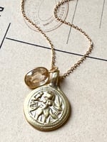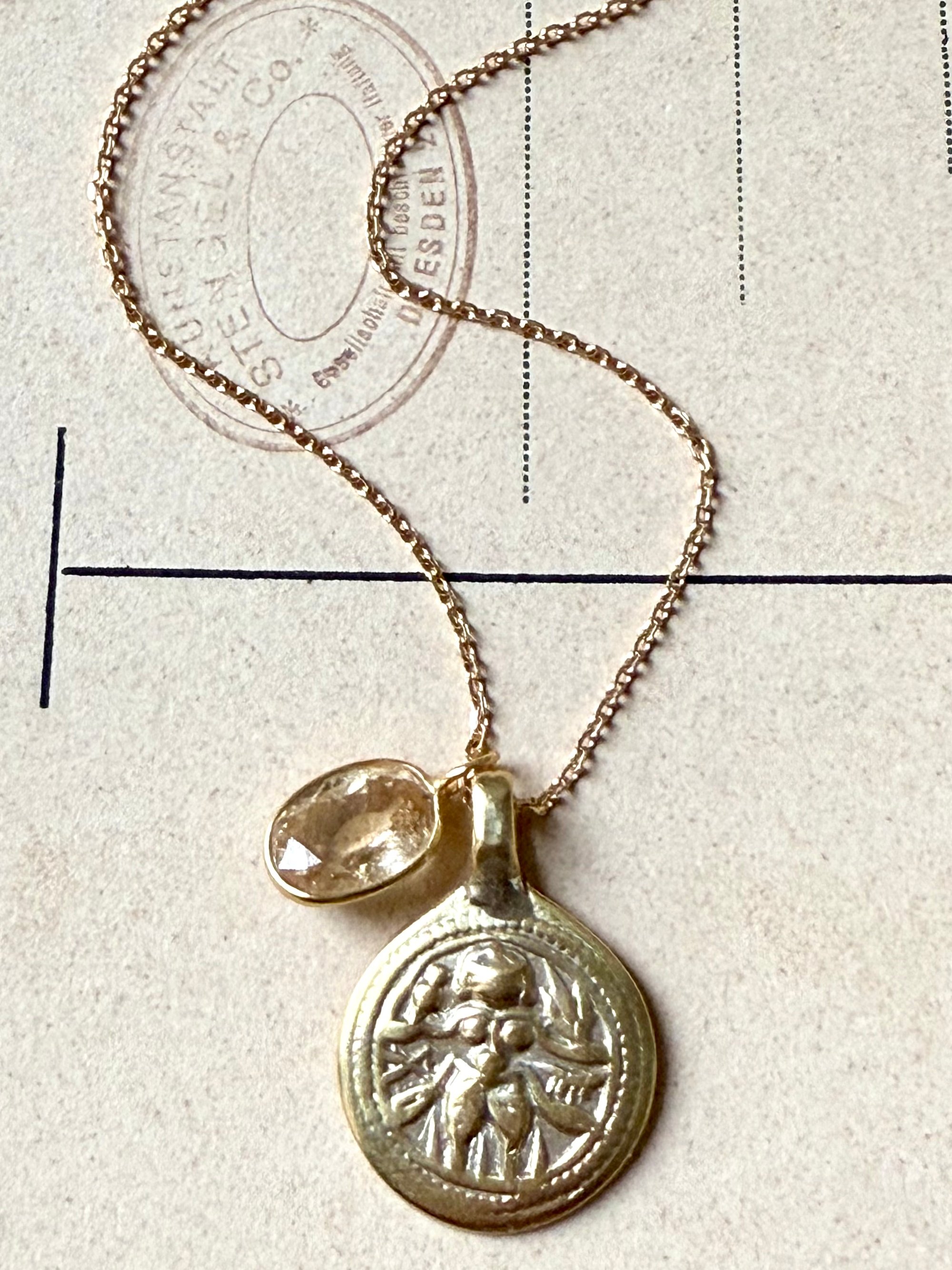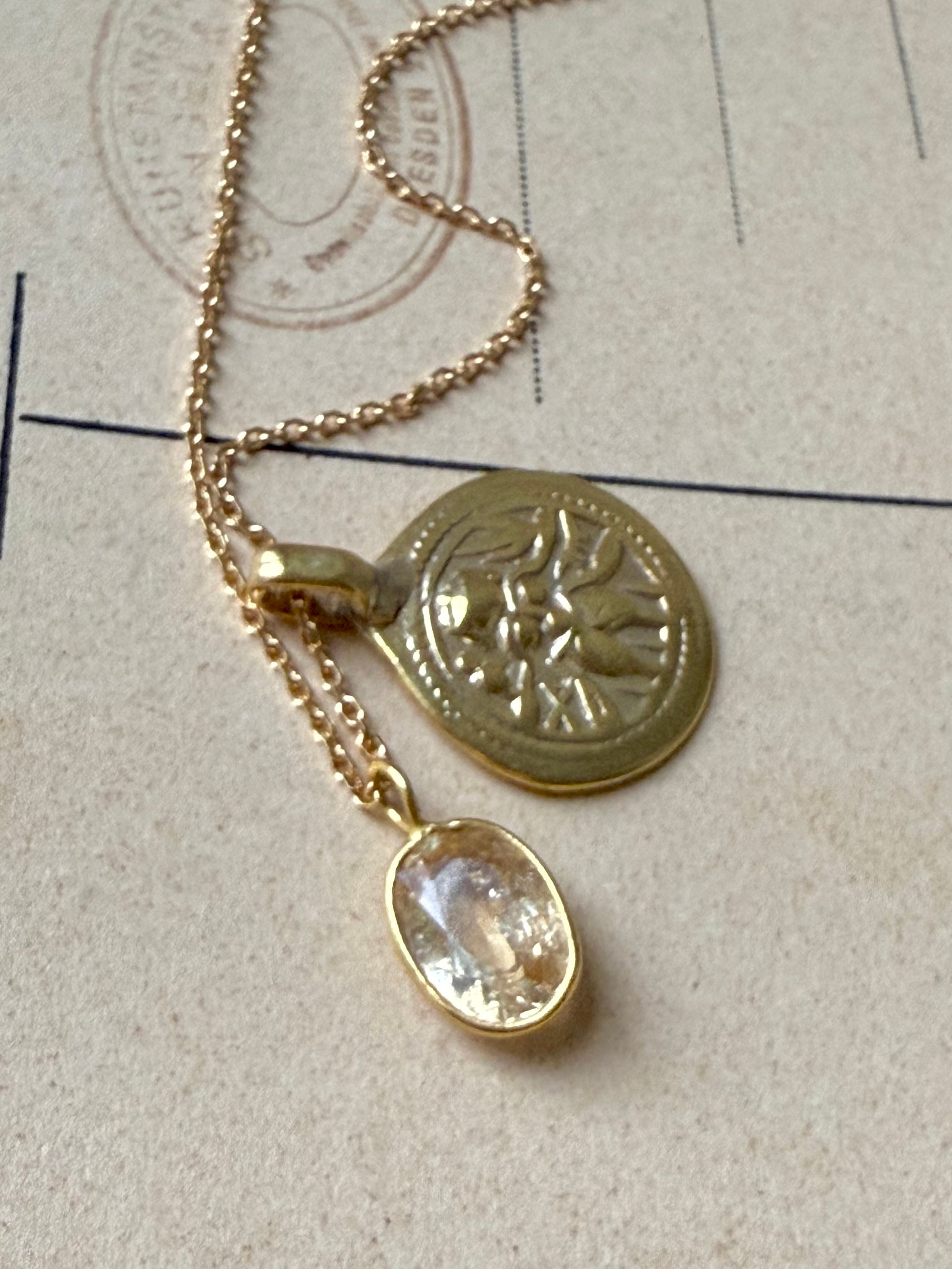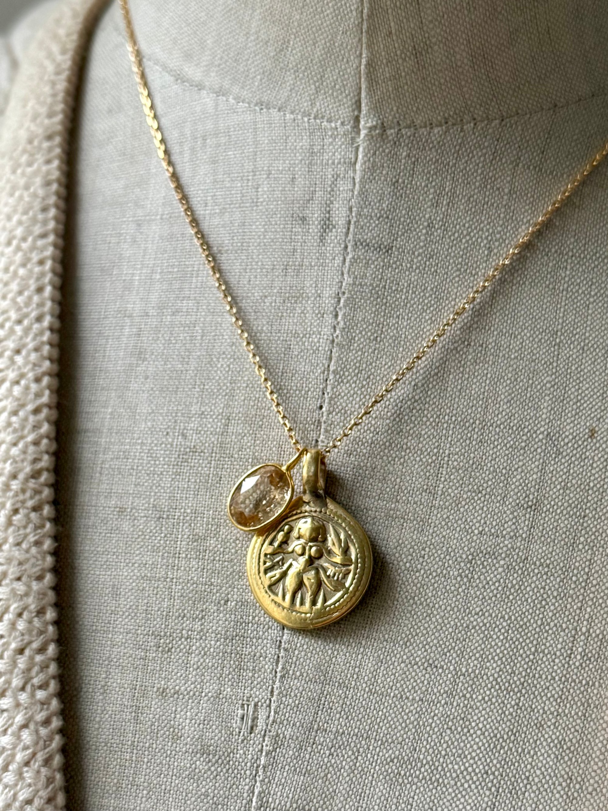Ce collier est composé d’une Amulette ancienne indienne représentant le dieu Shiva et d’un grenat impérial doré facetté .