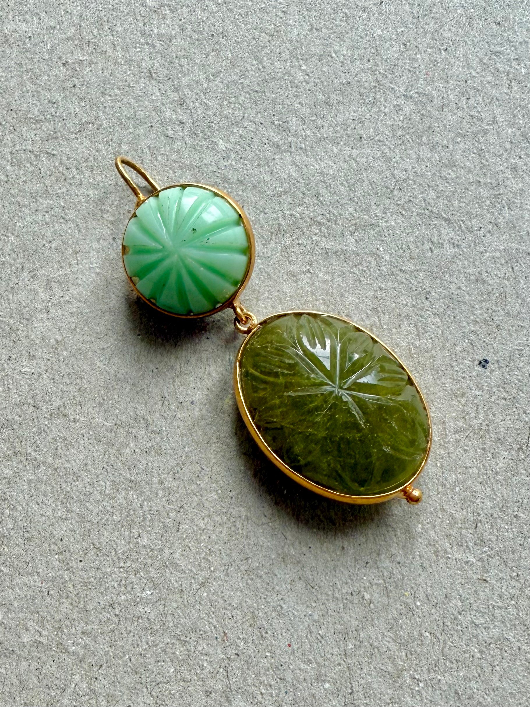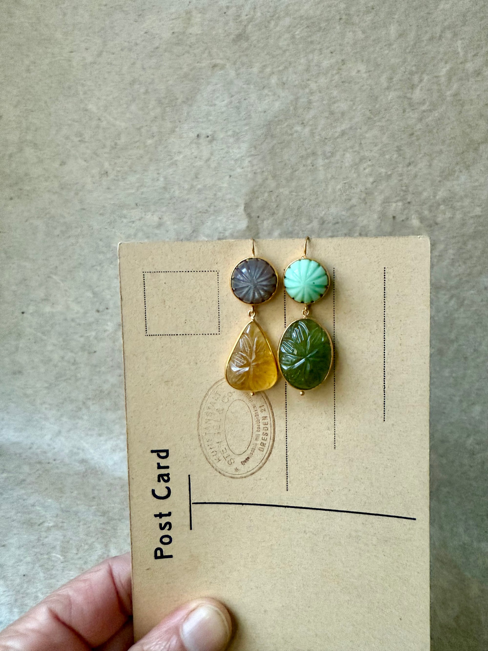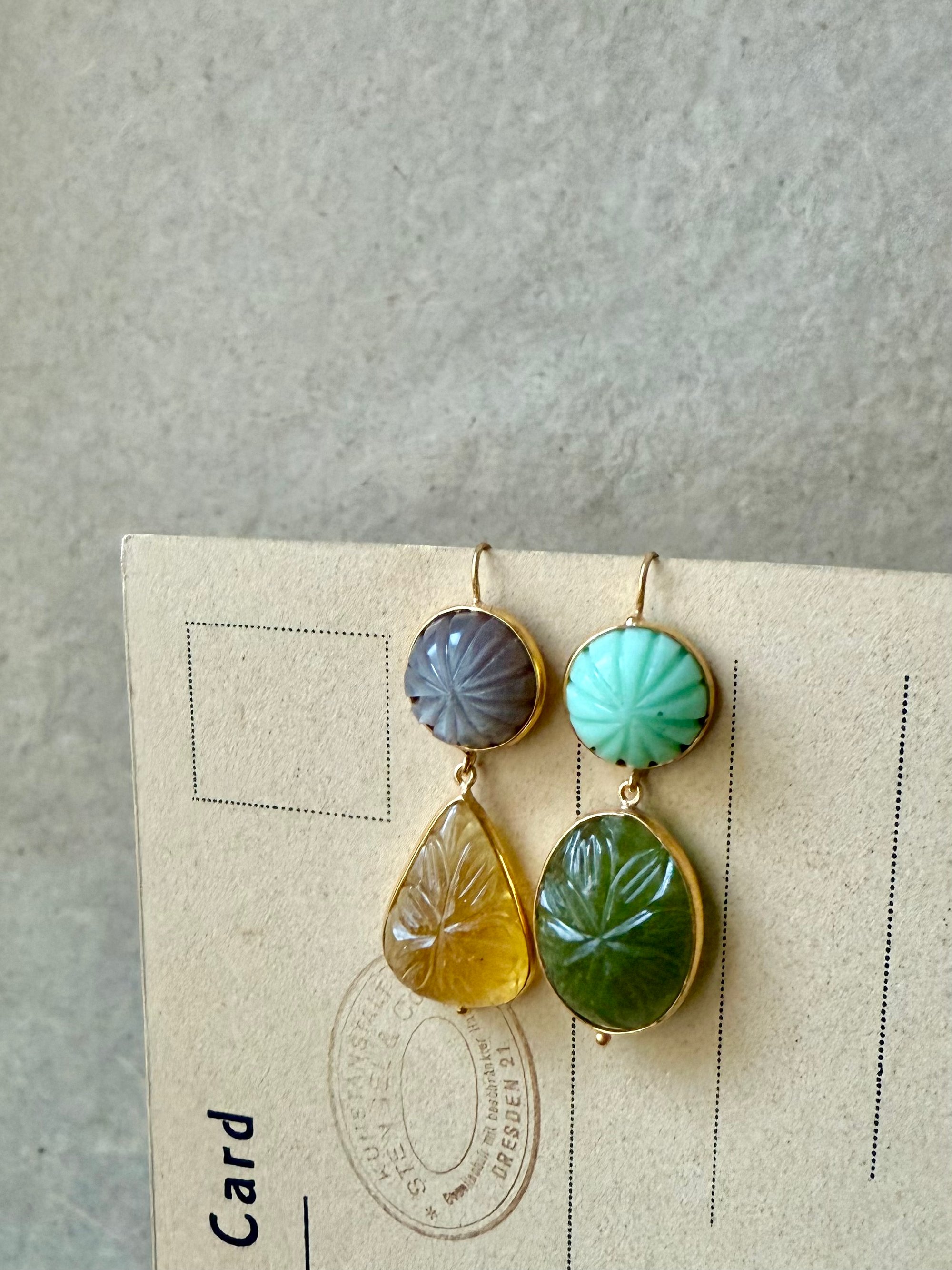 Boucle unique vendue à l’unité, composée de belles pierres fines taillées à l’atelier et assemblées. Les contrastes de couleurs révèlent l’intensité des pierres et les gravures. À vous de composer votre paire ou bien à porter seule .
