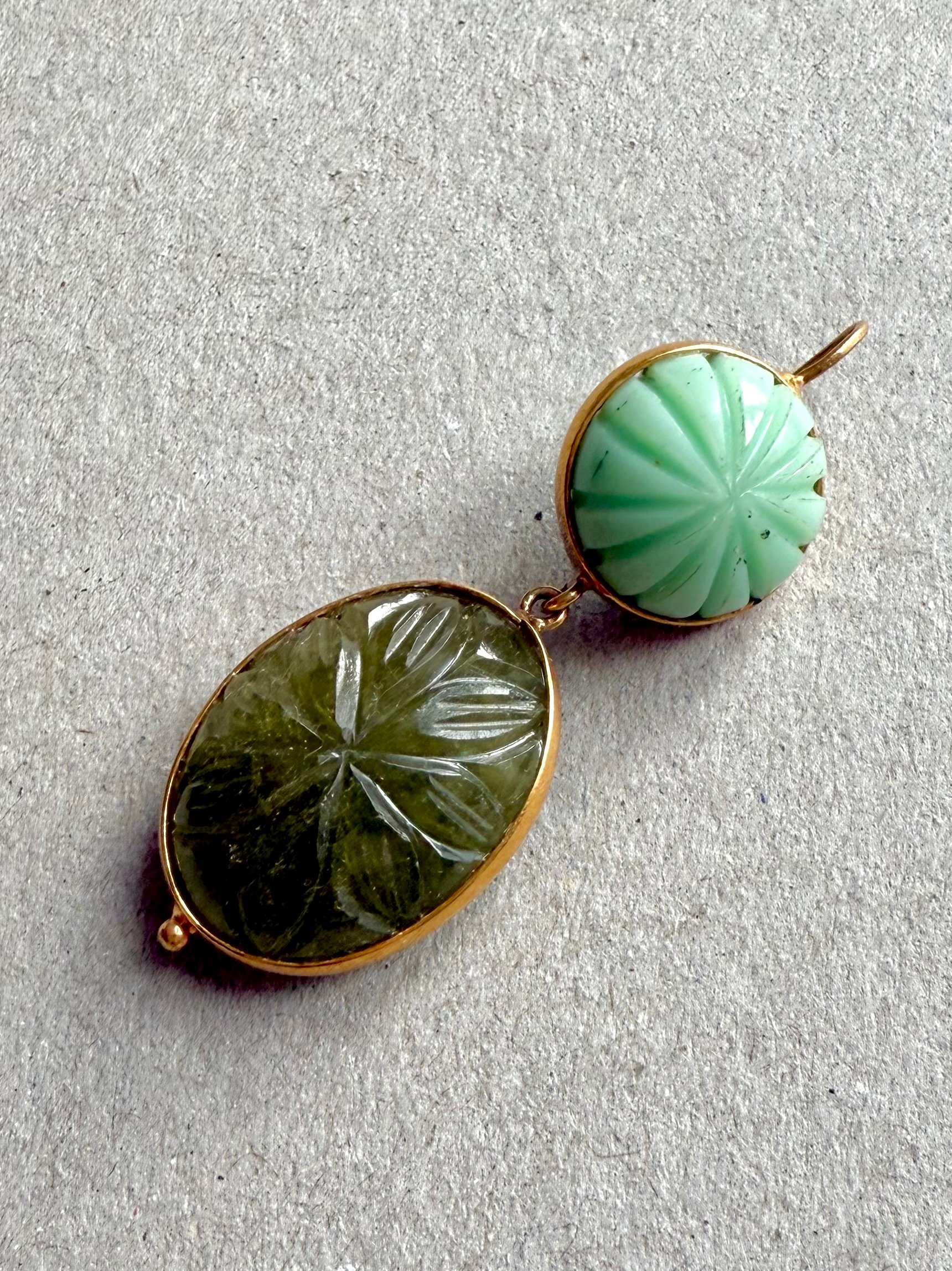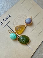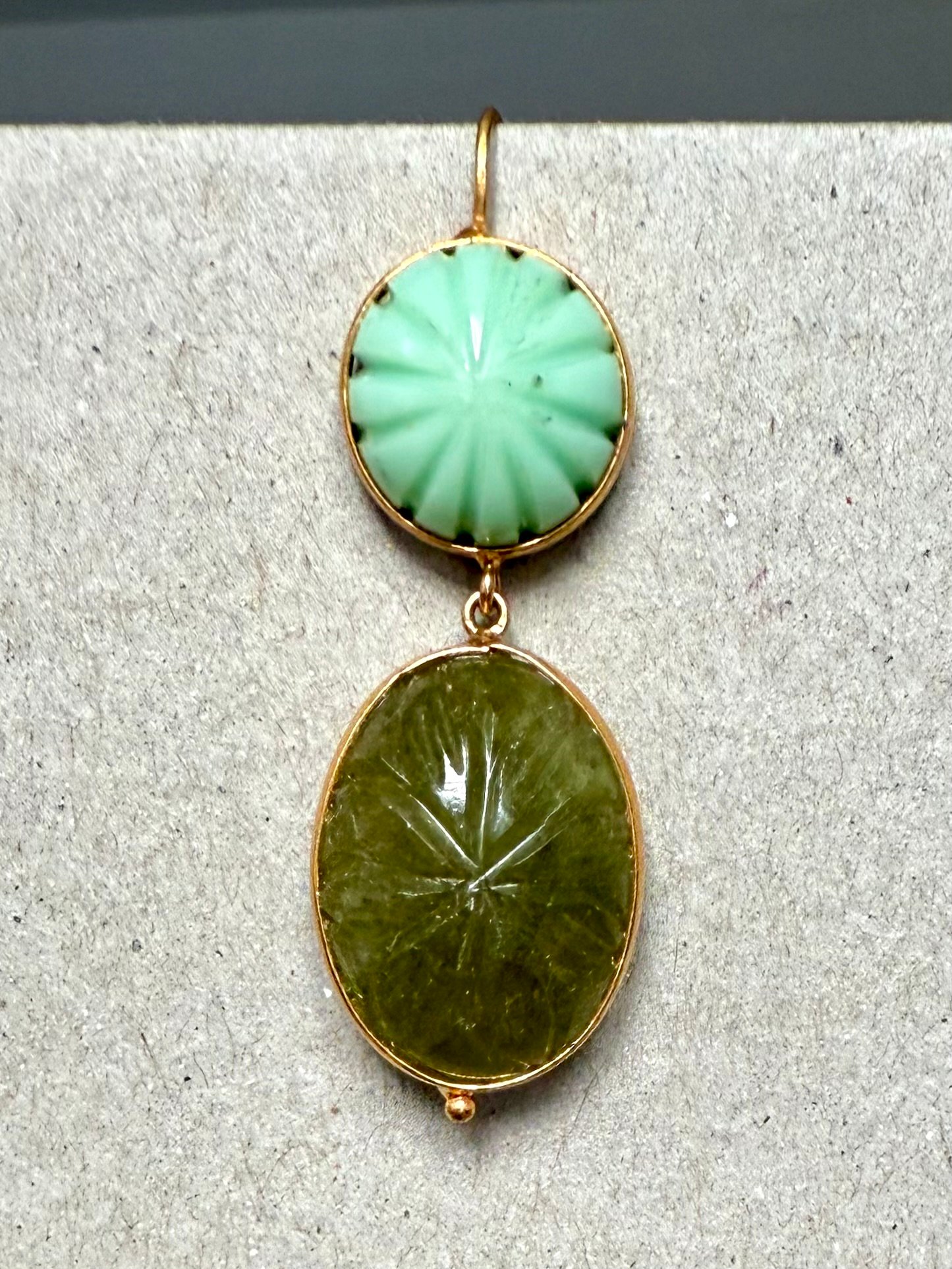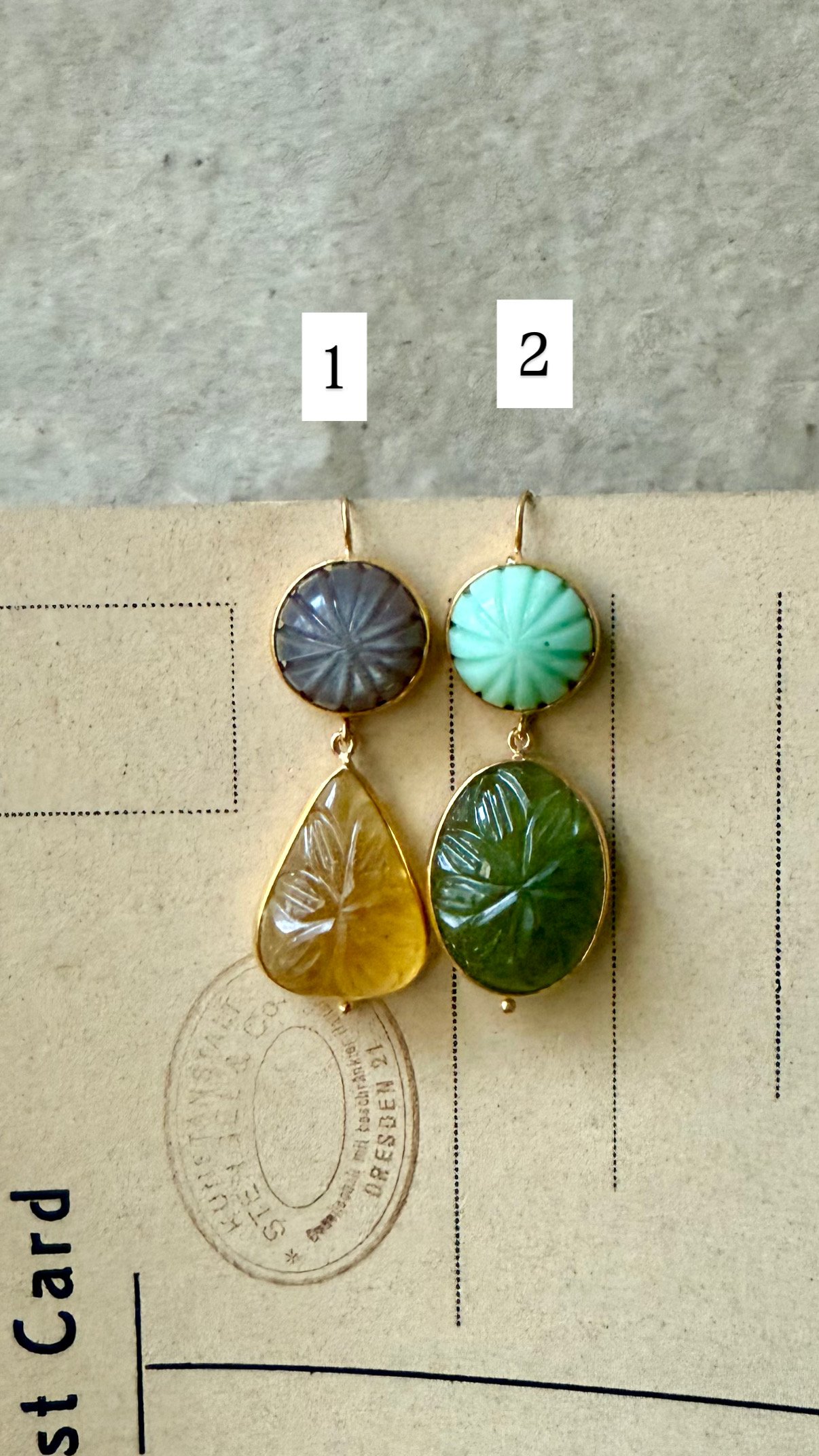 Boucle unique vendue à l’unité, composée de belles pierres fines taillées à l’atelier et assemblées. Les contrastes de couleurs révèlent l’intensité des pierres et les gravures. À vous de composer votre paire ou bien à porter seule .