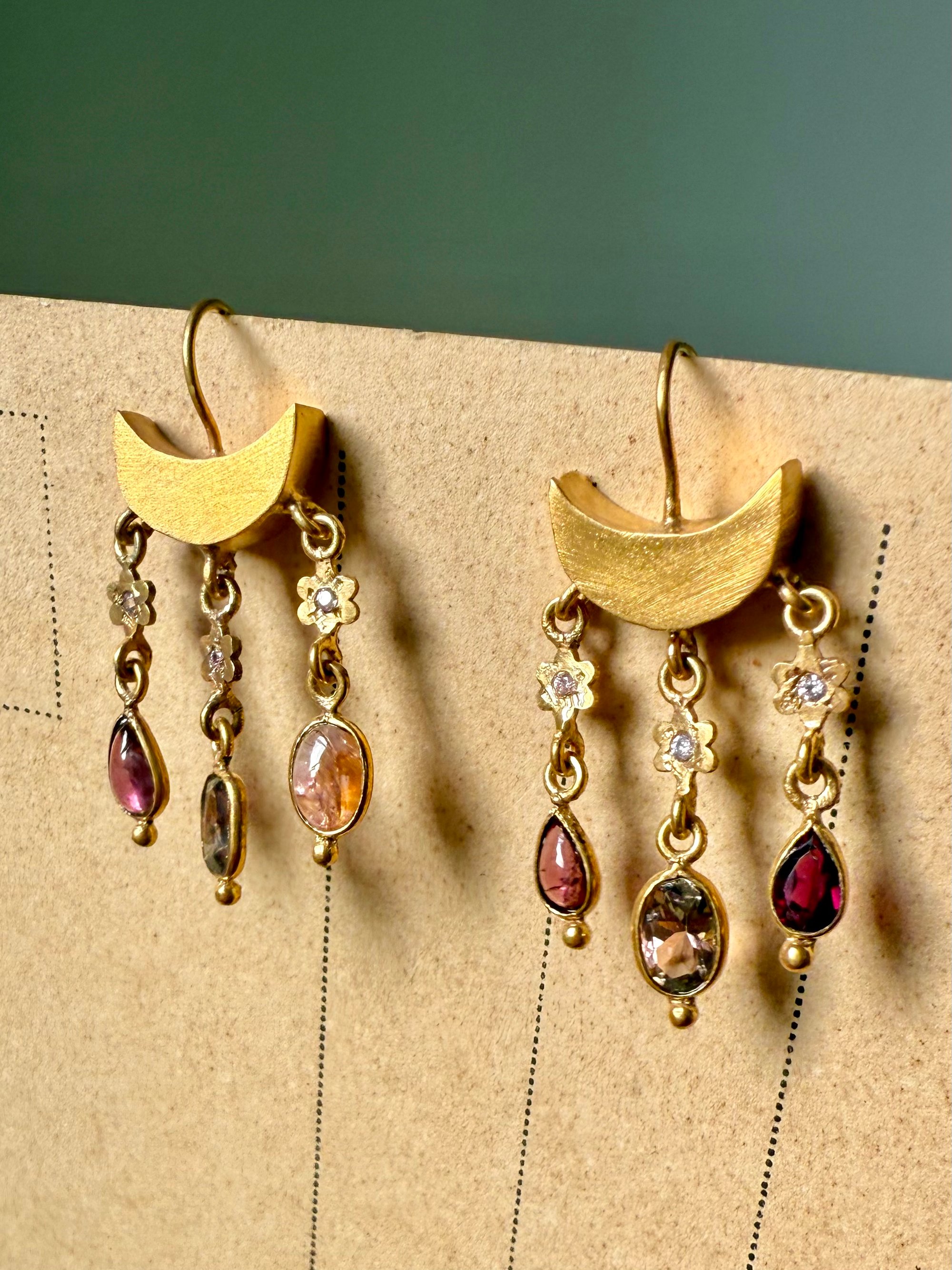 Ce croissant de lune soutiens une cascade de fleurs serties et de pierres fines multicolores