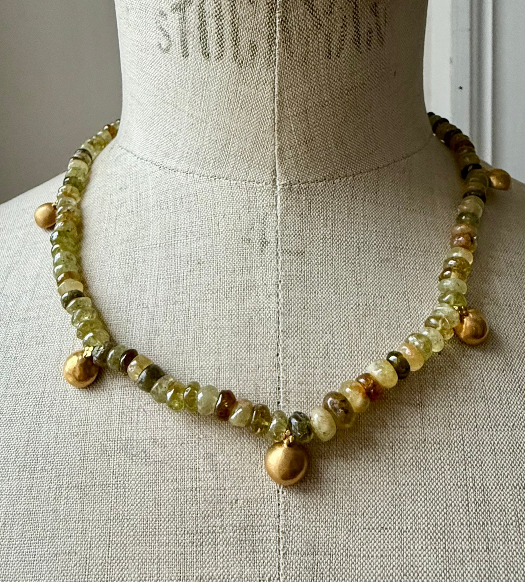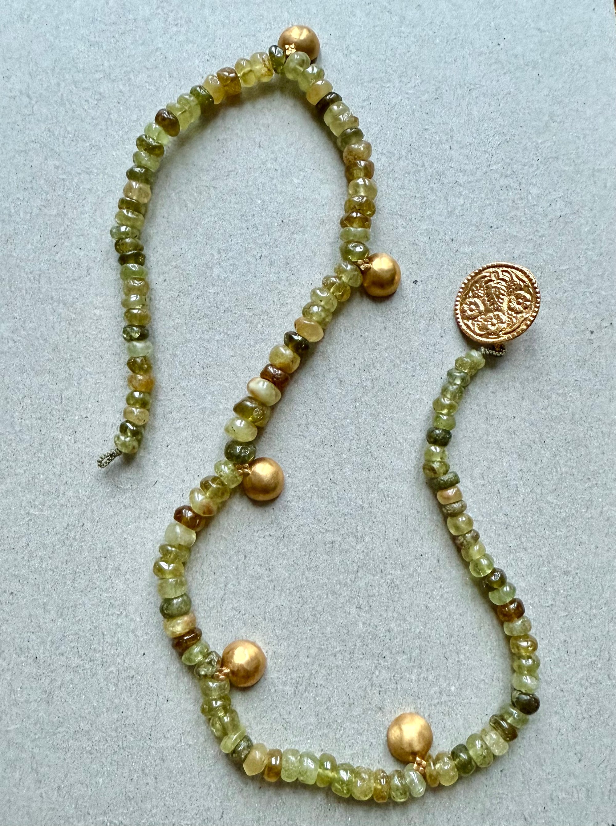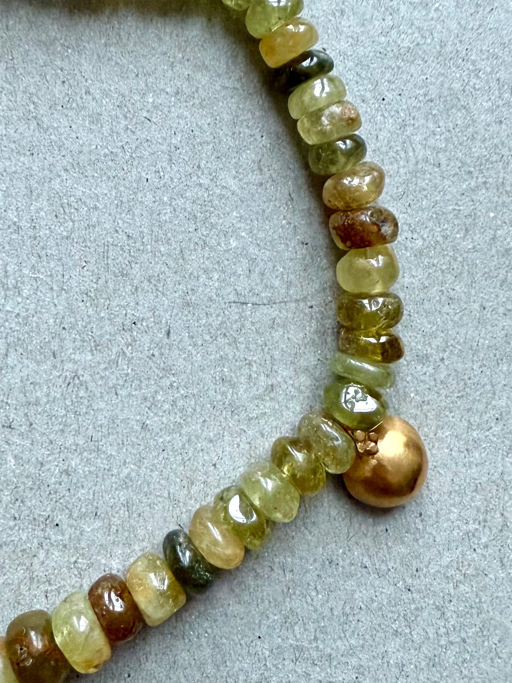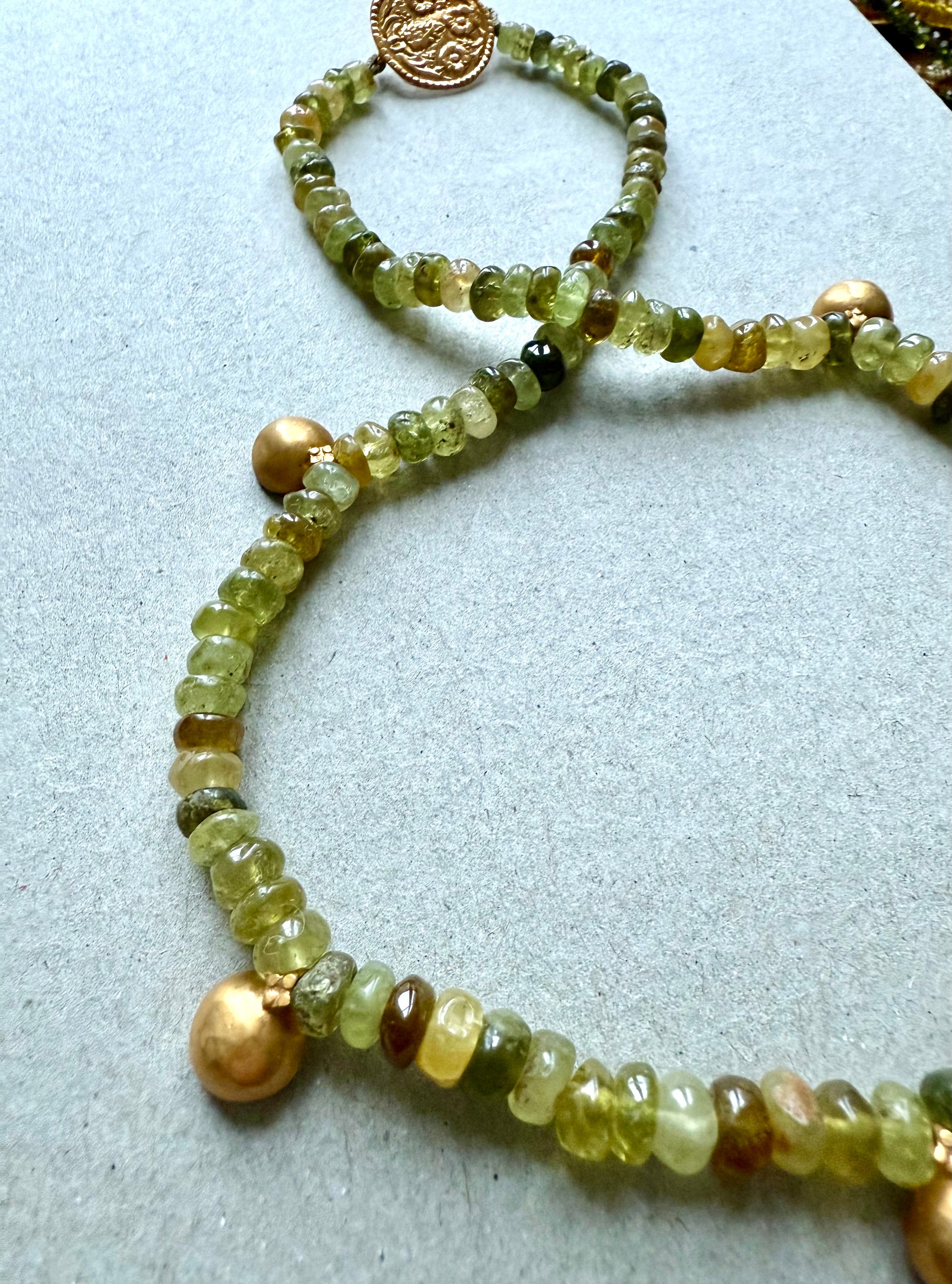 Collier en perles de grenats verts dans les dégradés de tons miel et verts , parsemés de 5 perles semi-sphériques en bronze doré à l’or , rappelant une parure ancienne. Son fermoir bijoux est inspiré d’une pièce ancienne ornée de fleurs, en plaqué or . Collier très lumineux à porter seul ou en accumulation.