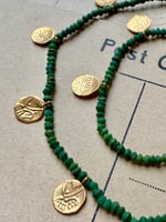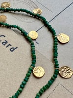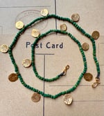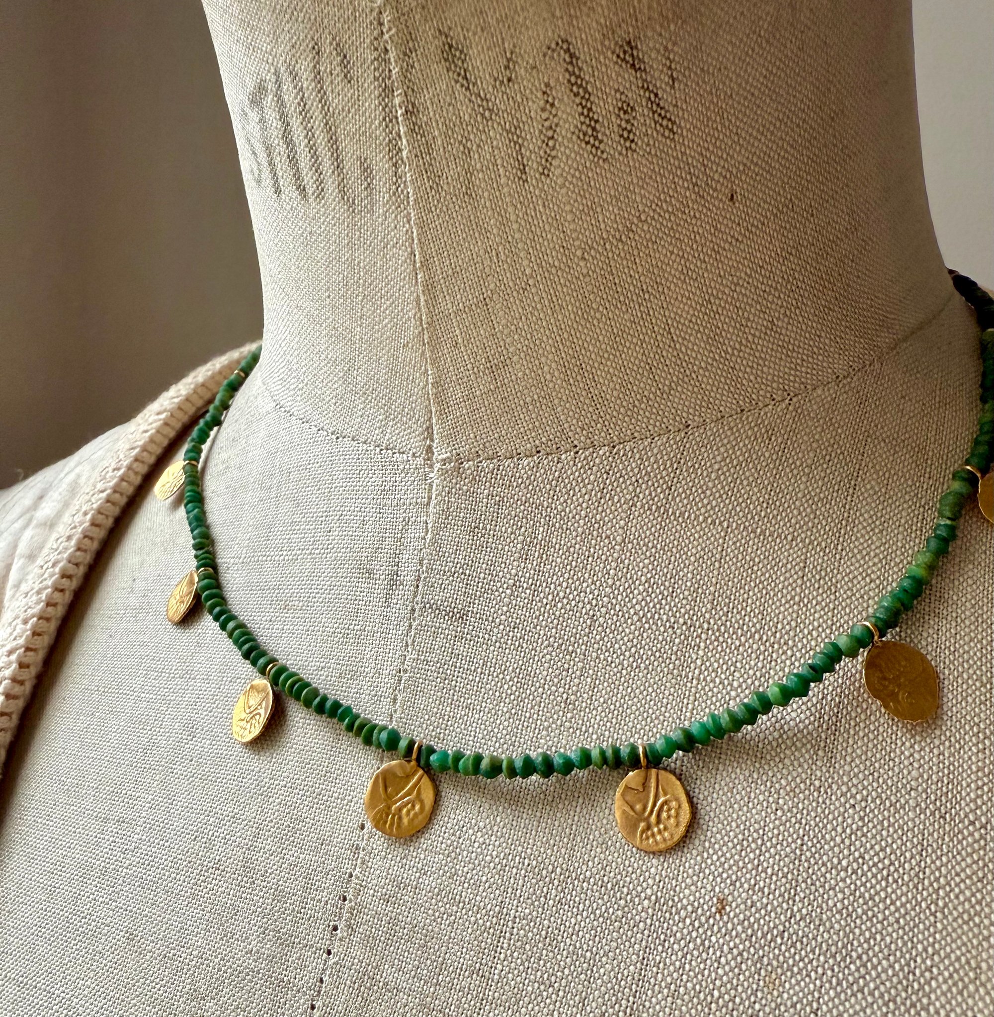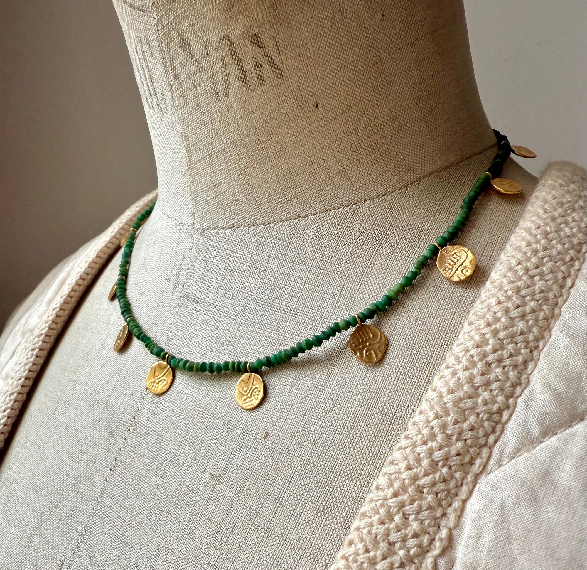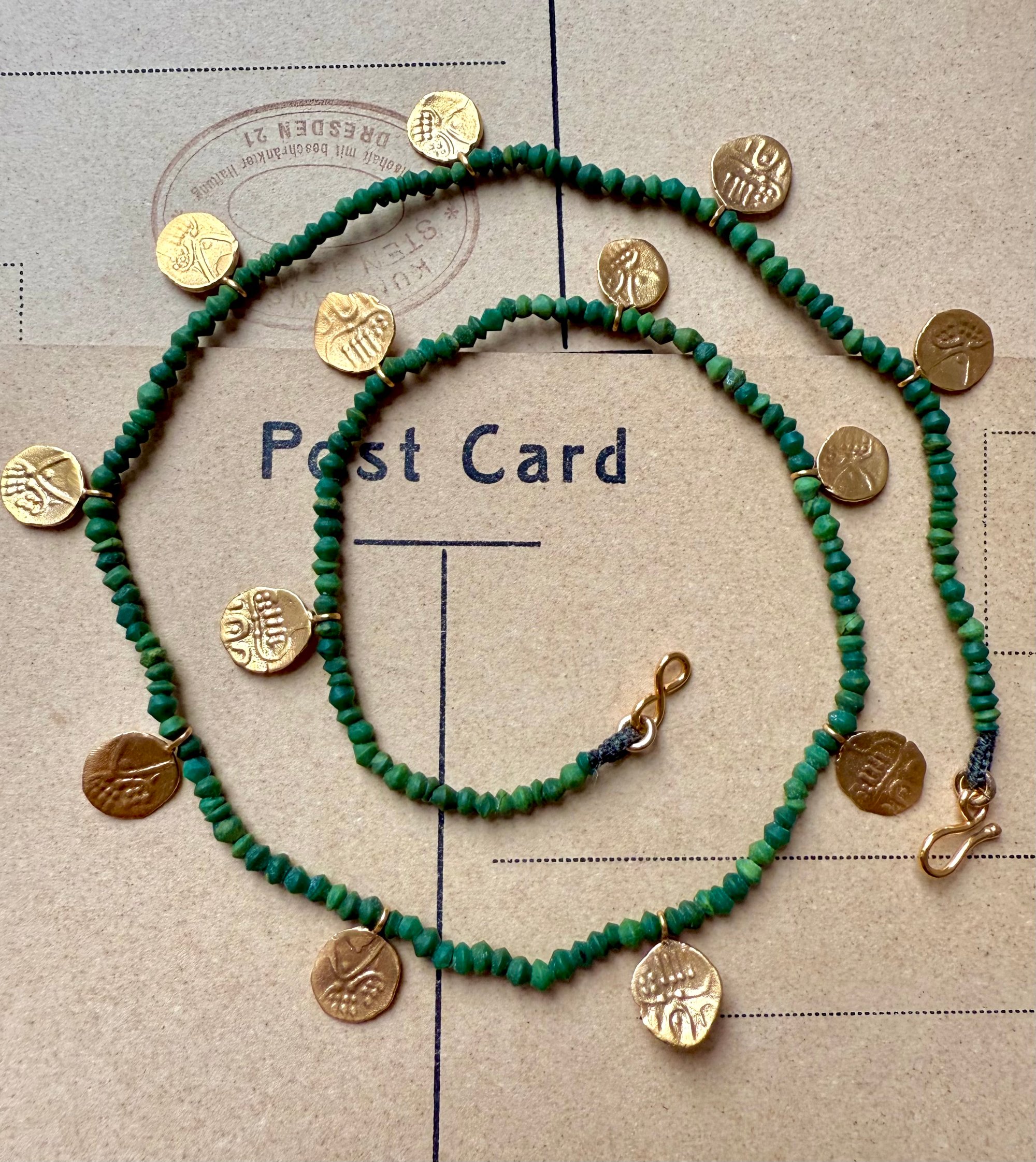 Collier simple et fin 1 rang de turquoises vertes d’Afghanistan, facettées et mates , à porter seul ou en accumulation . Chaque collier est parsemé 13 petites pièces avec des inscriptions de chèques faces , réplique de monnaies anciennes du sud de l’Inde .
