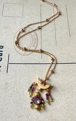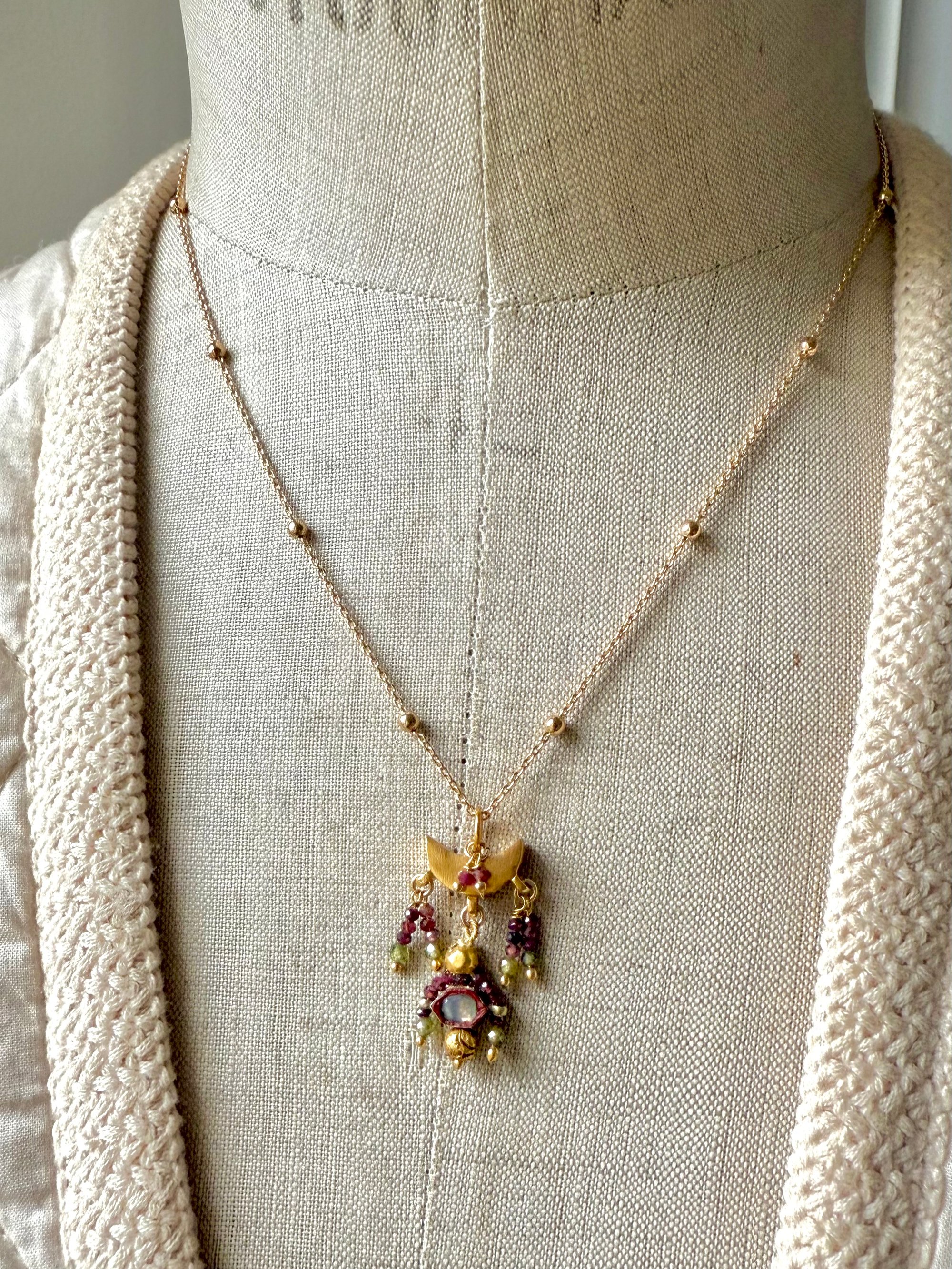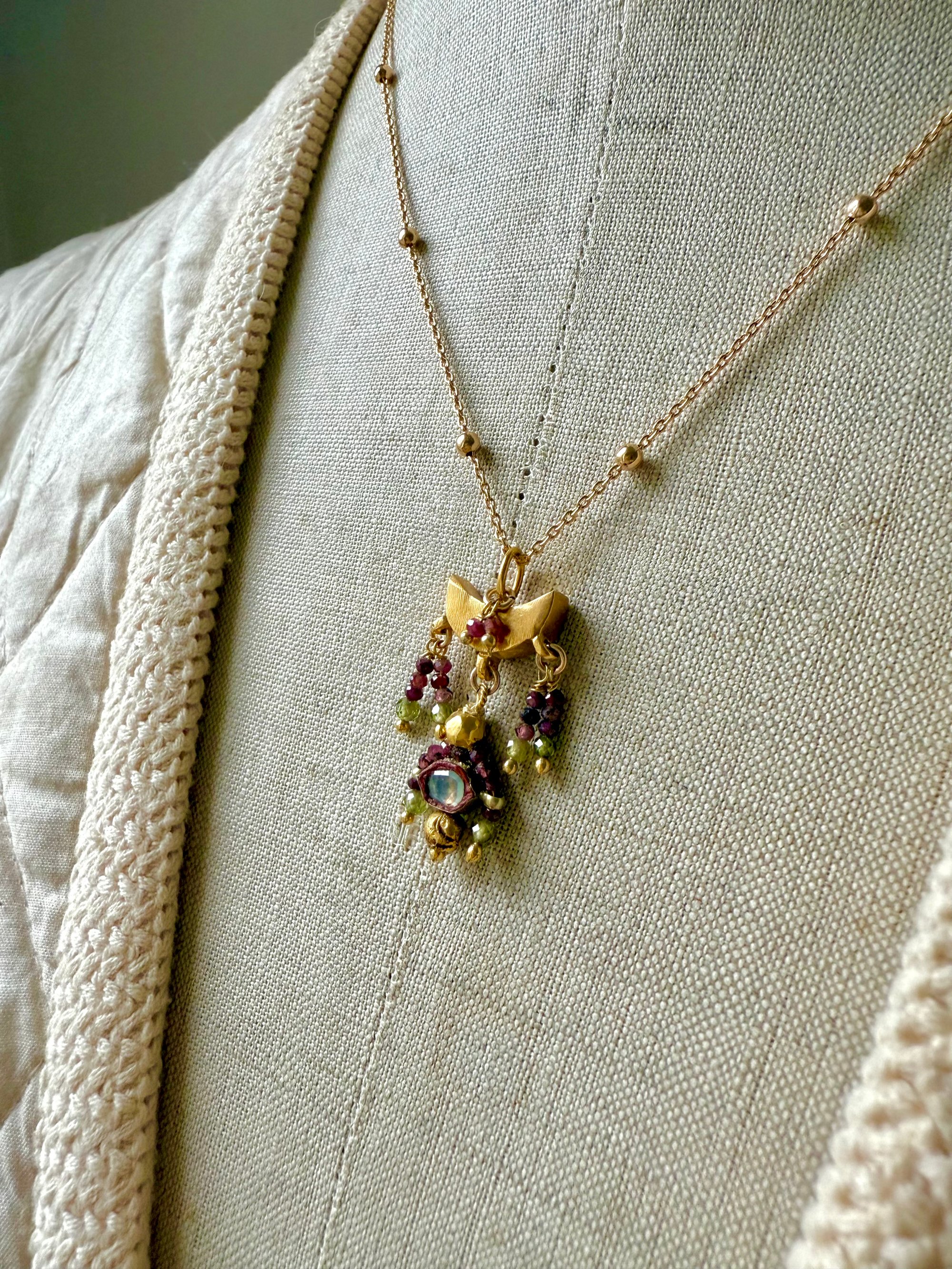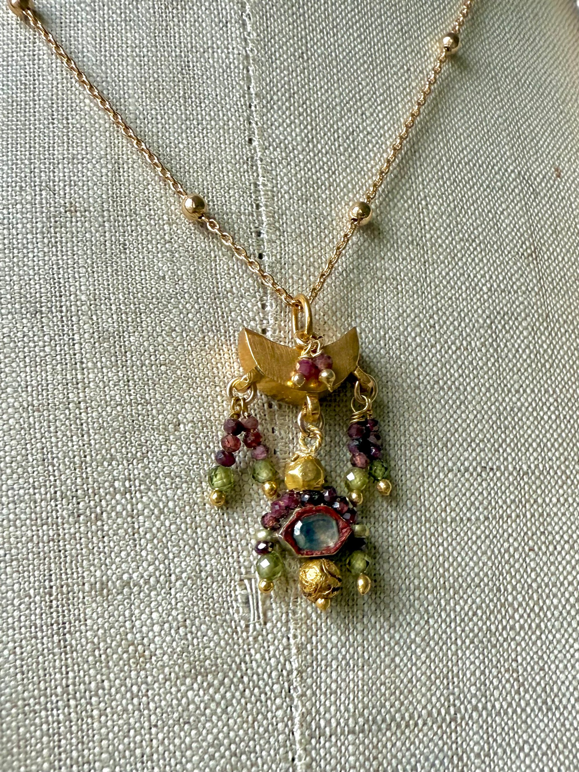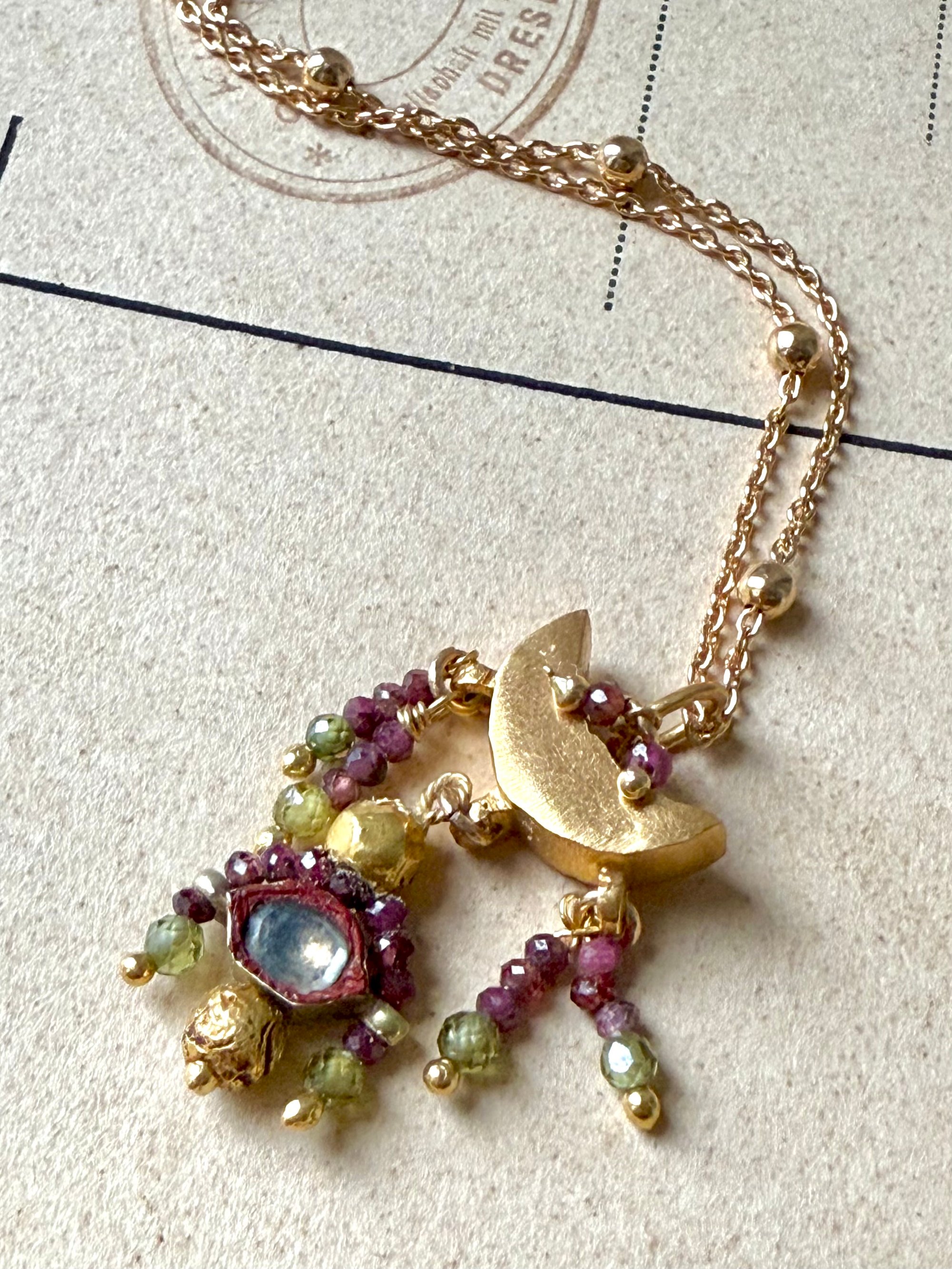 Ce croissant de lune soutient une cascade de rubis et zircons verts, d’une perle ancienne en or et diamant très belle qualités, de deux perles rondes anciennes en or ouvragées .