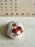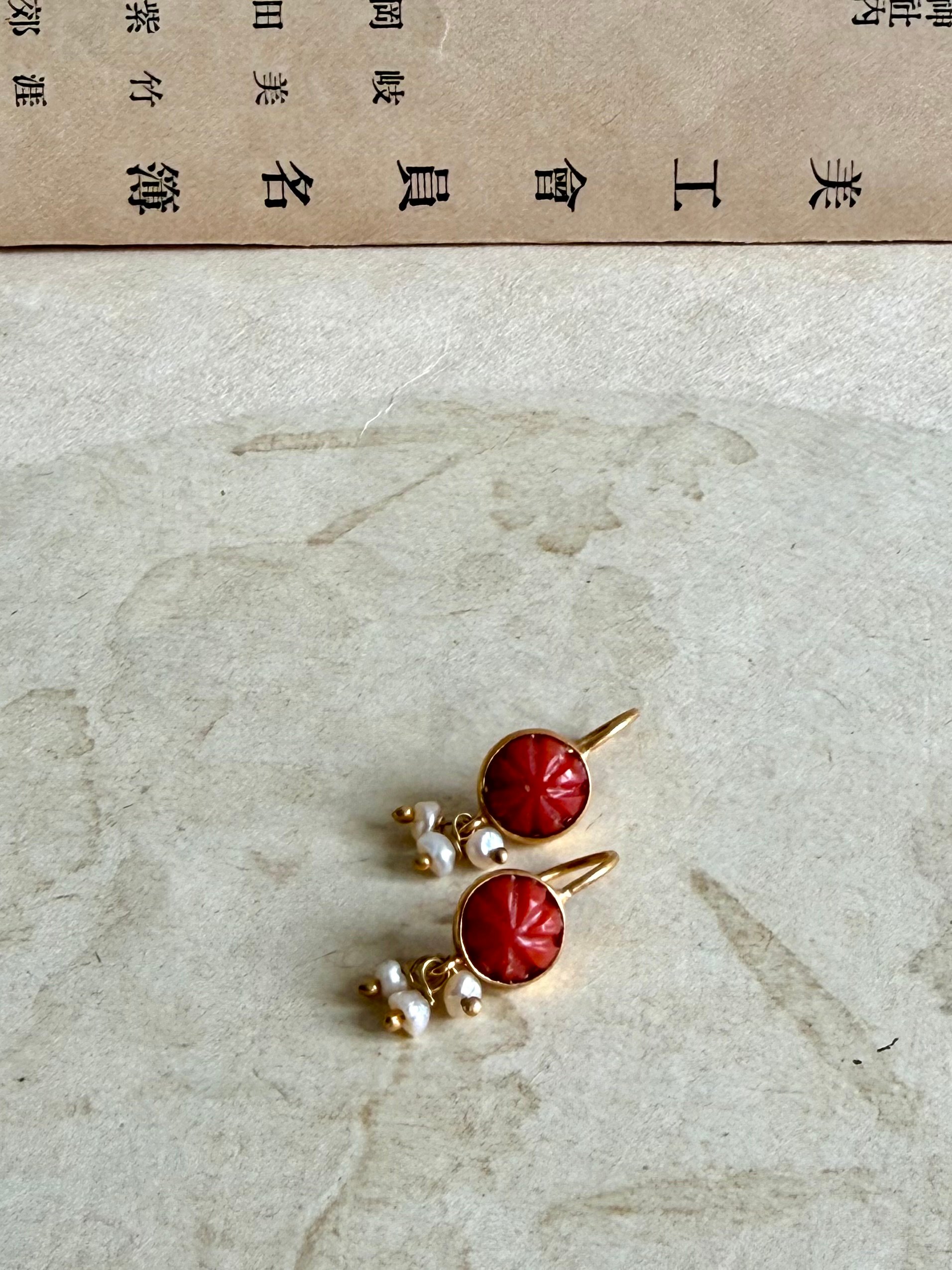 Paire de boucles en corail gravé avec pampilles en perles fines.