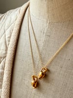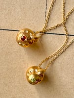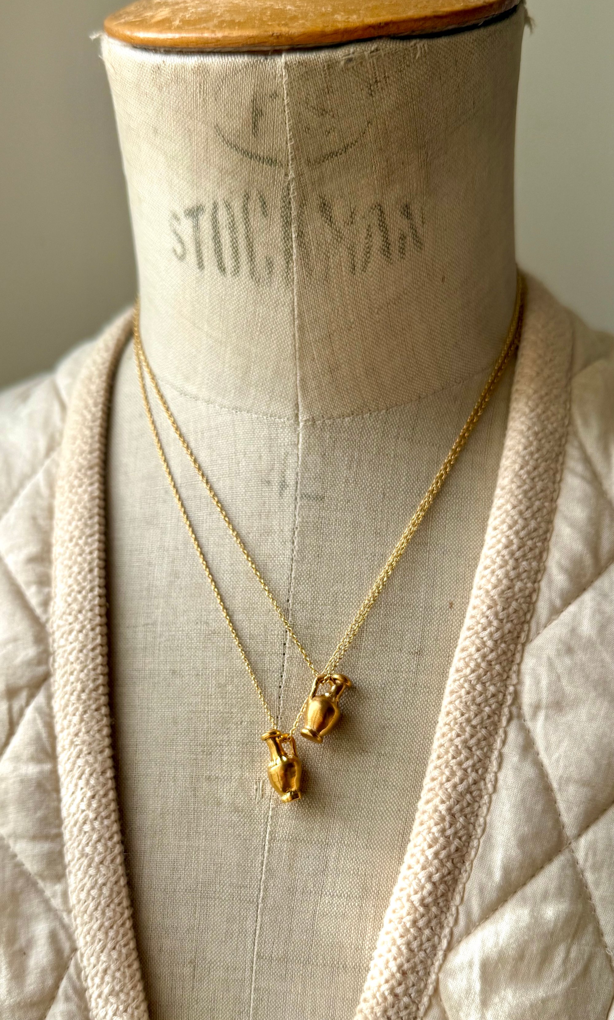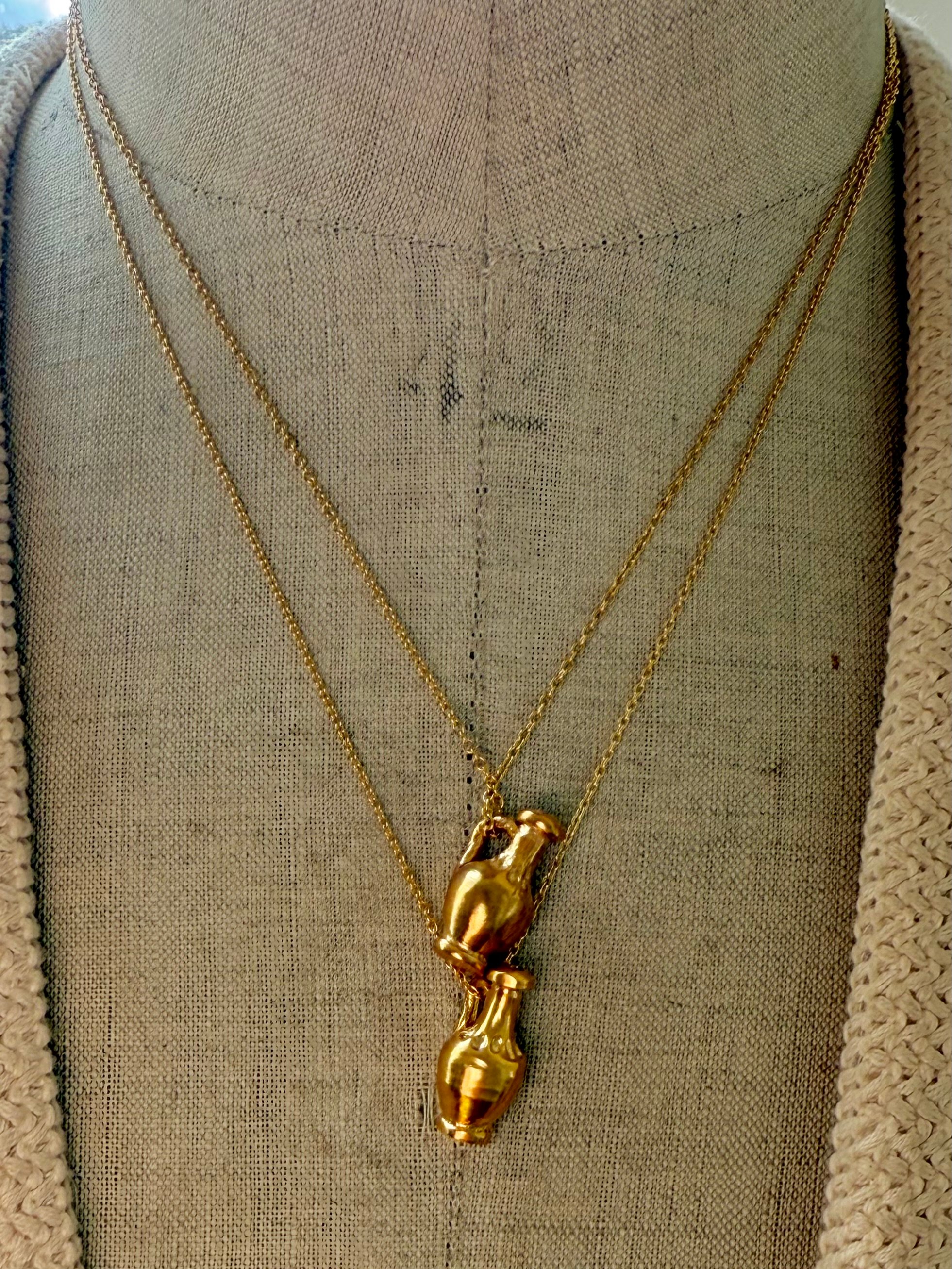 Le col de l’amphore est serti d’un brillant grenat orangé ou vert péridot , à votre choix . Vous pourrez la glisser simplement sur un chaîne fine ou la cumuler avec vos autre trésors .