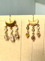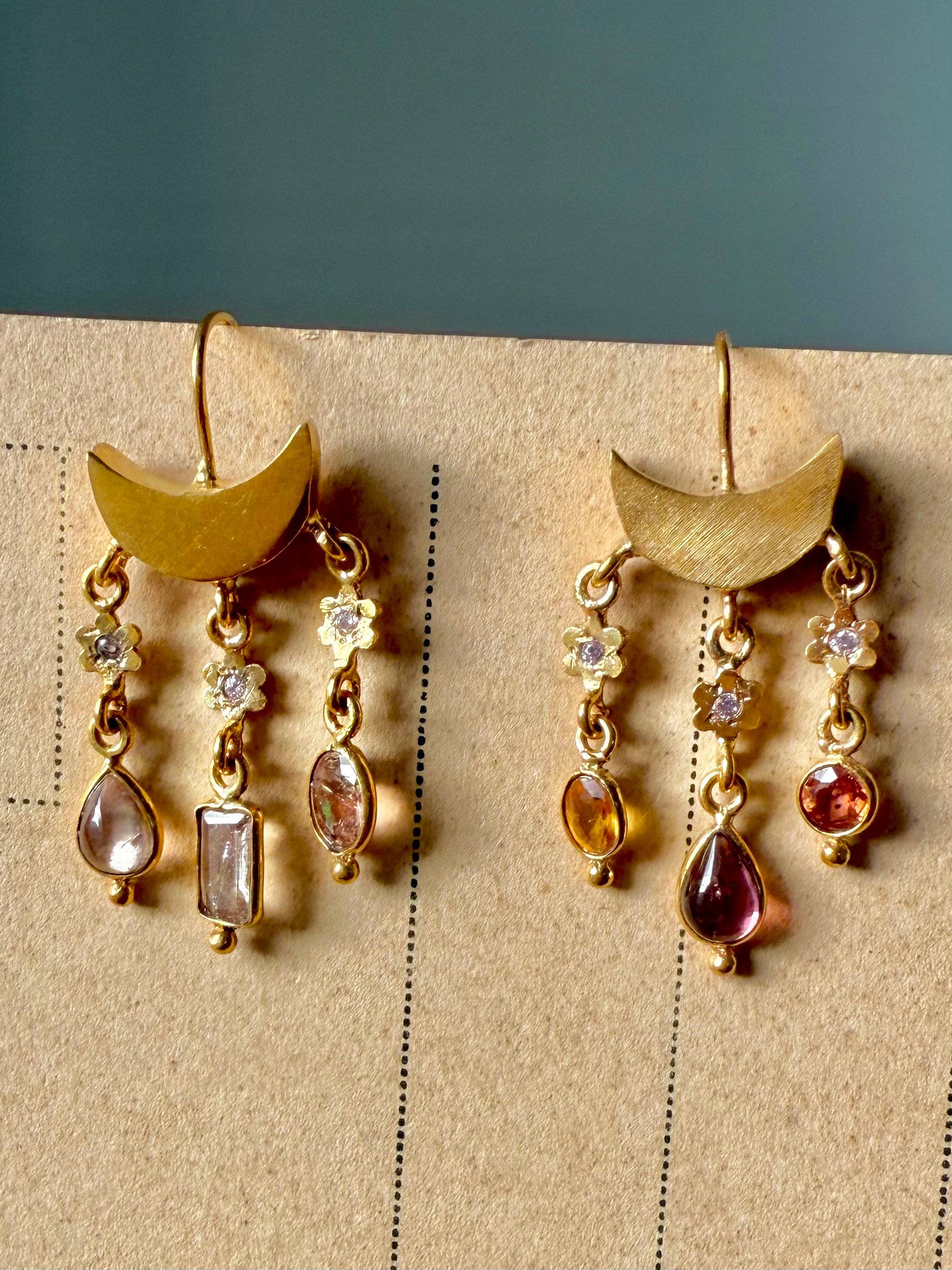 Le premier croissant de la nouvelle lune est fascinante en Inde de par sa position ( comme sur la boucle ) . Elle est aussi plantée dans la longue chevelure de Shiva symbolisant le cycle du temps. Il n’en fallait pas moins pour m’inspirer cette boucle d’oreille unique !