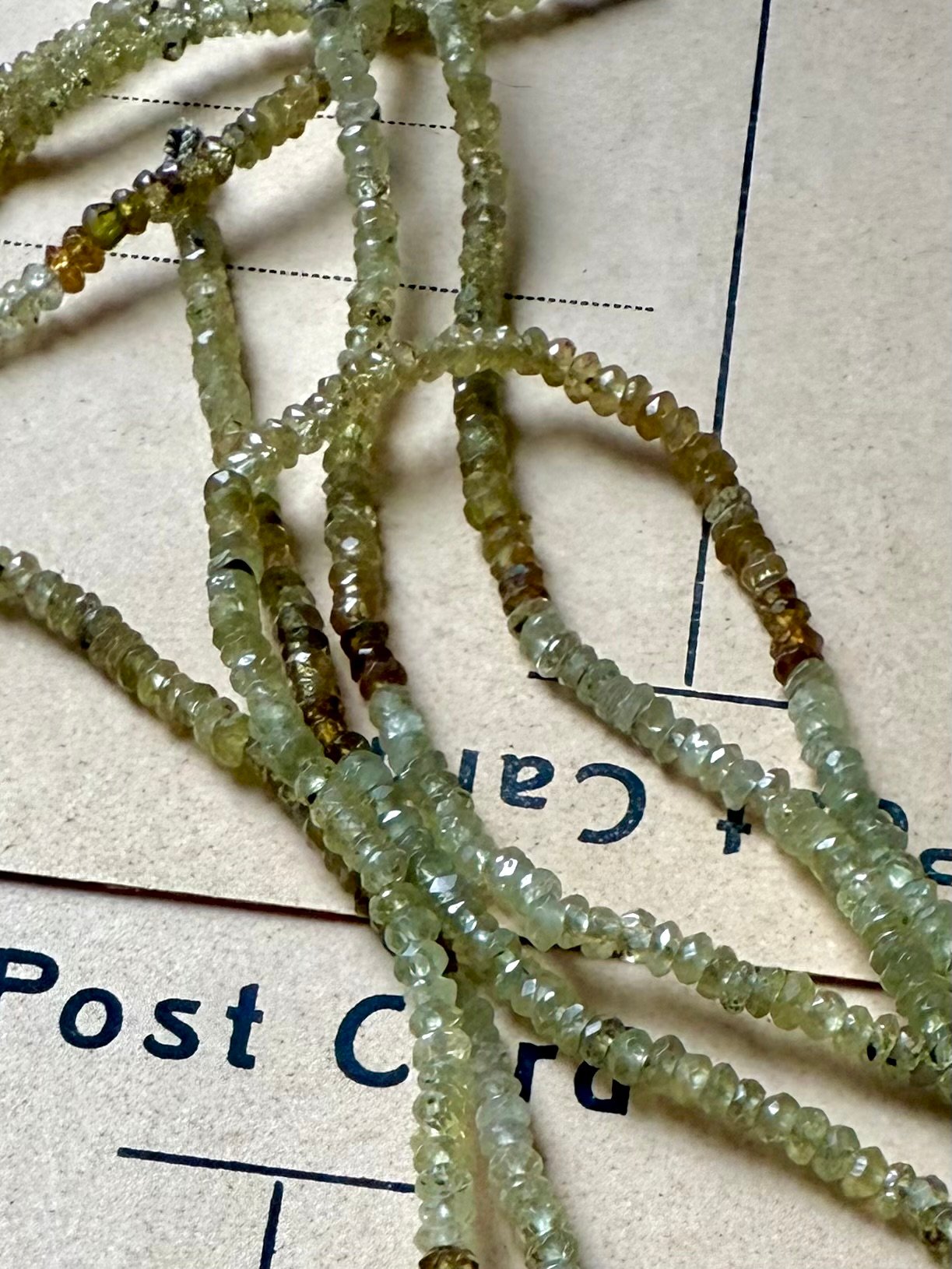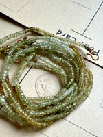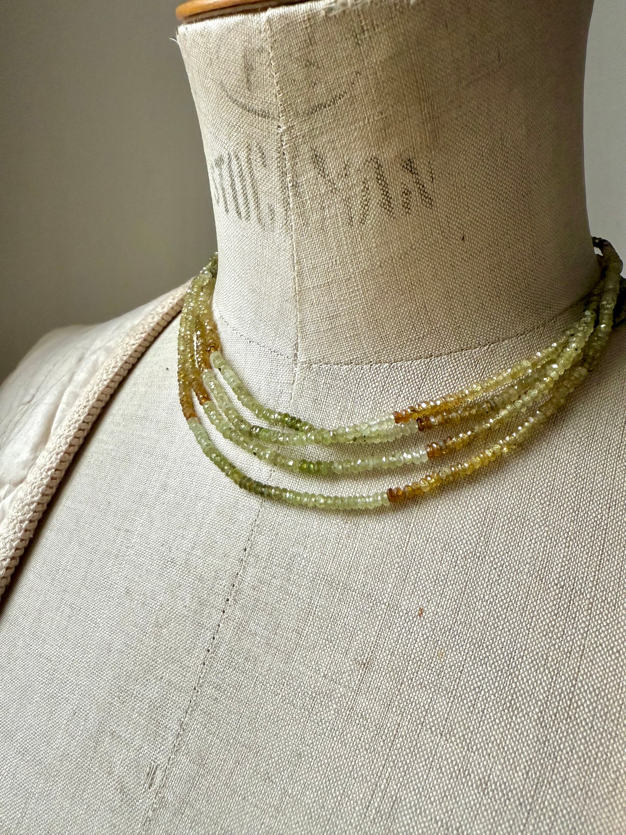 Collier simple et fin 1 rang de tourmalines vertes facettées, dans des tons mousses et miel , à porter seul ou en accumulation .