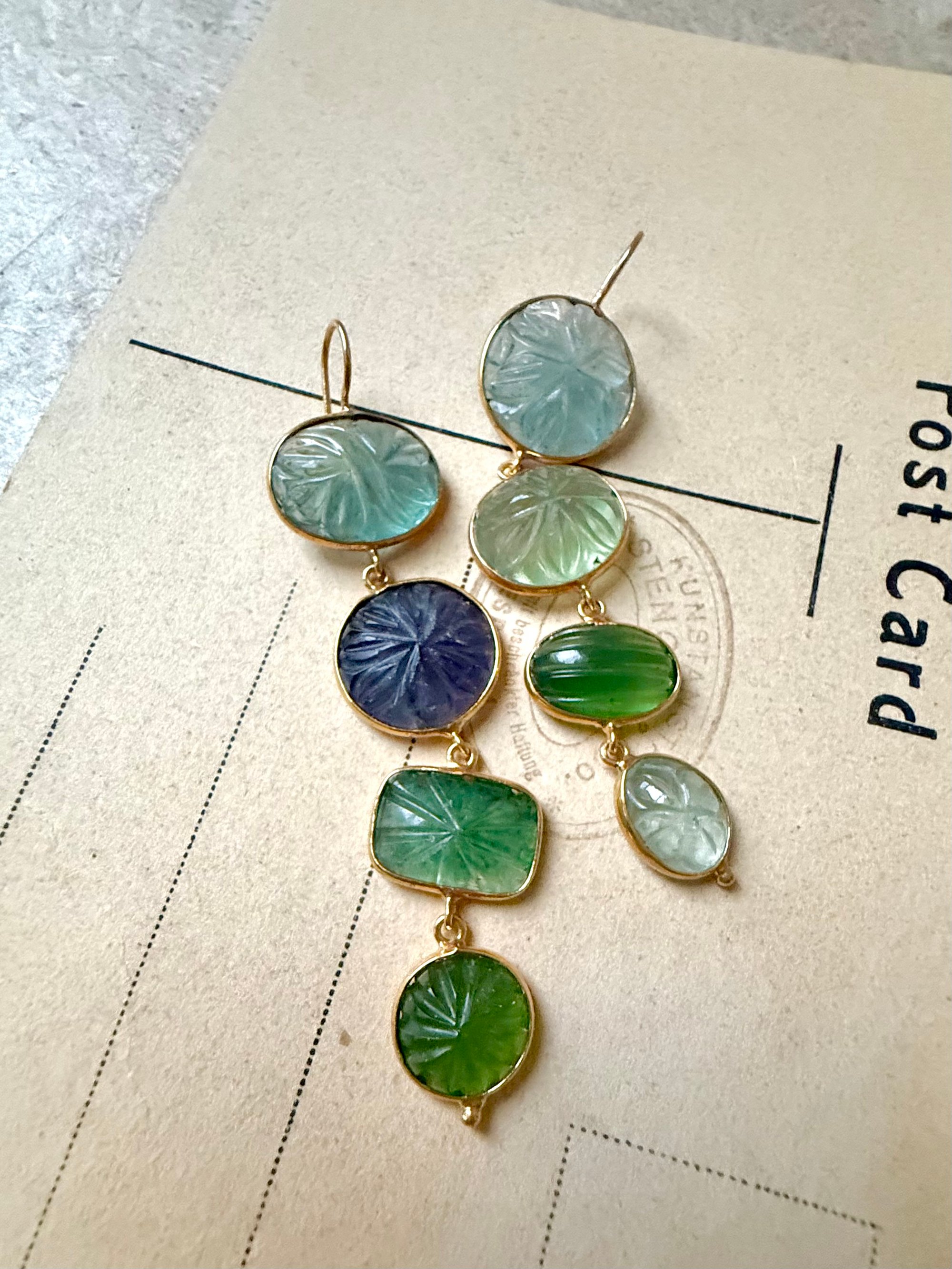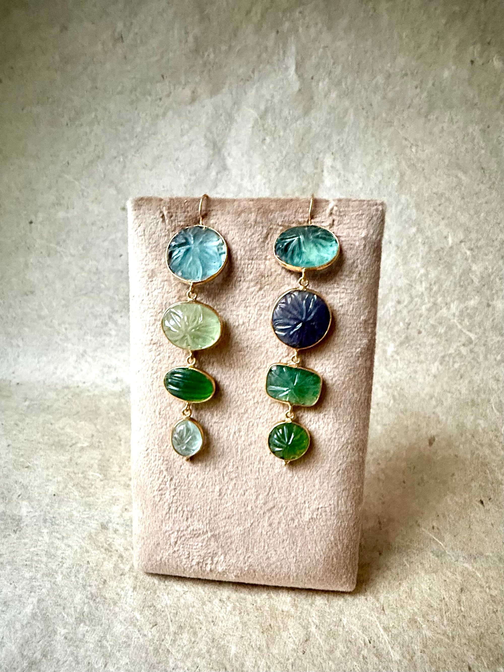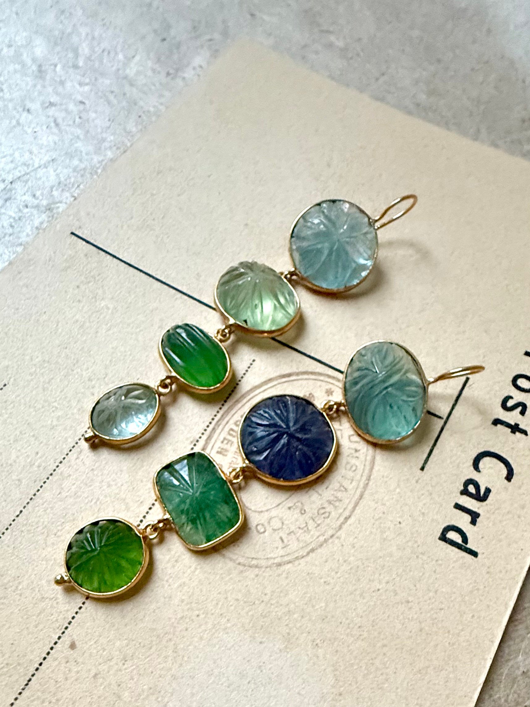 Boucles longues vendues par paire , composées de belles pierres fines taillées à l’atelier et assemblées. Les contrastes de couleurs révèlent l’intensité des pierres et des gravures. La paire idéale pour réveiller vos tenues de fêtes !