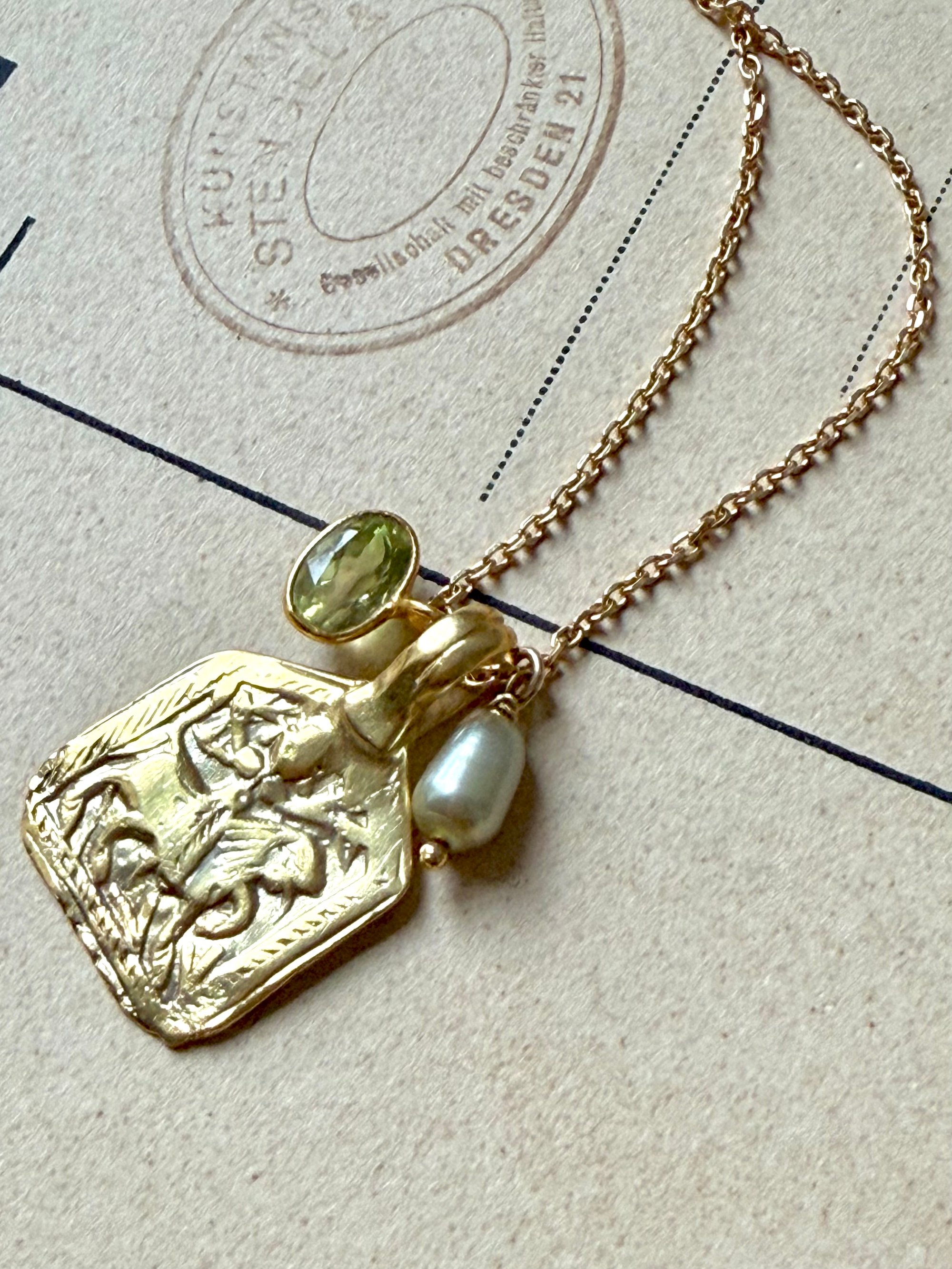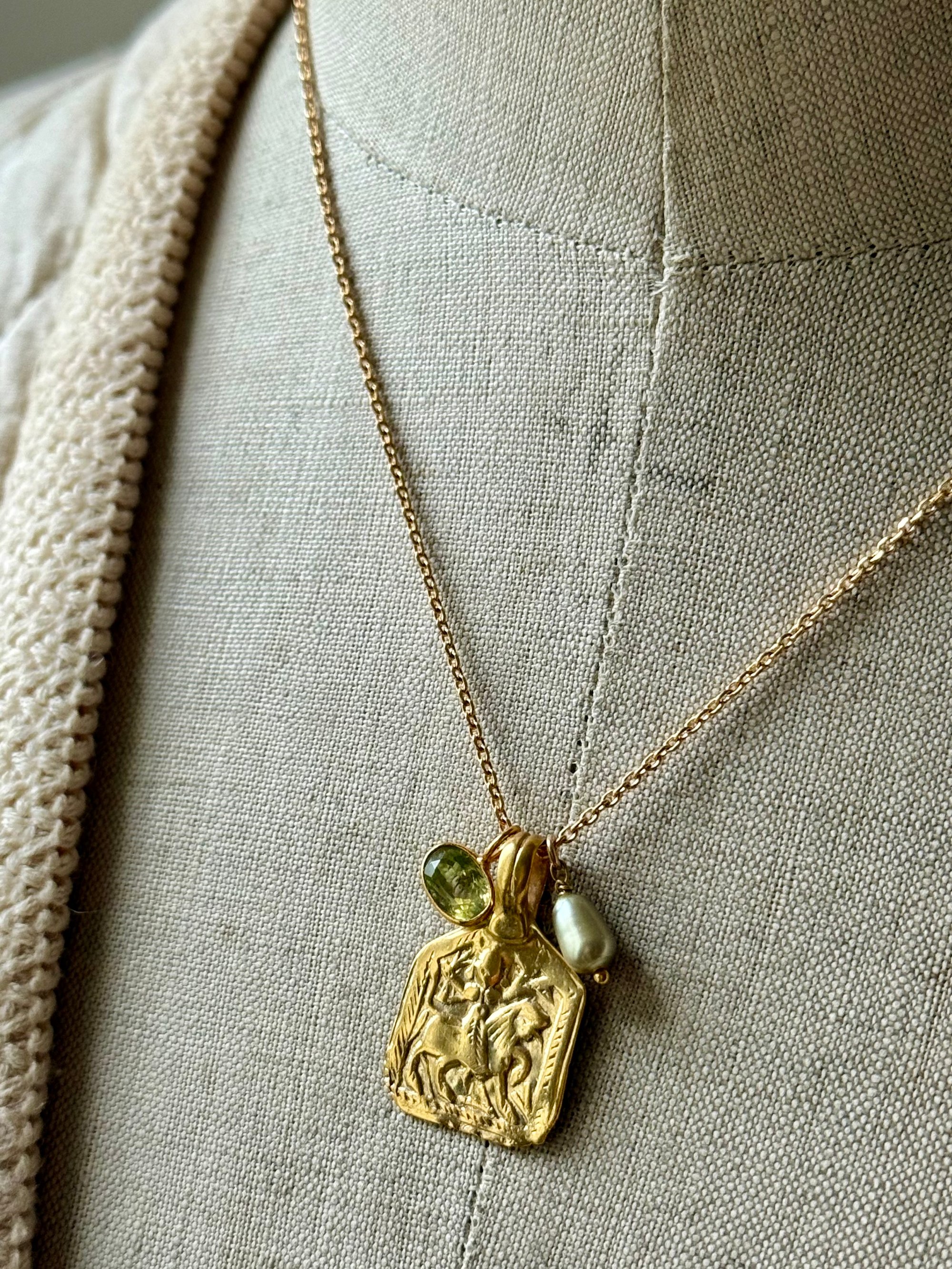 Ce collier est composé d’une Amulette ancienne indienne représentant la déesse Durga sur son lion , une tourmaline verte facettée et une perle fine verte.